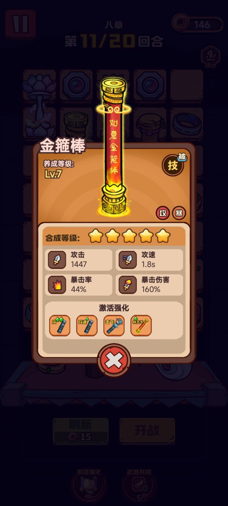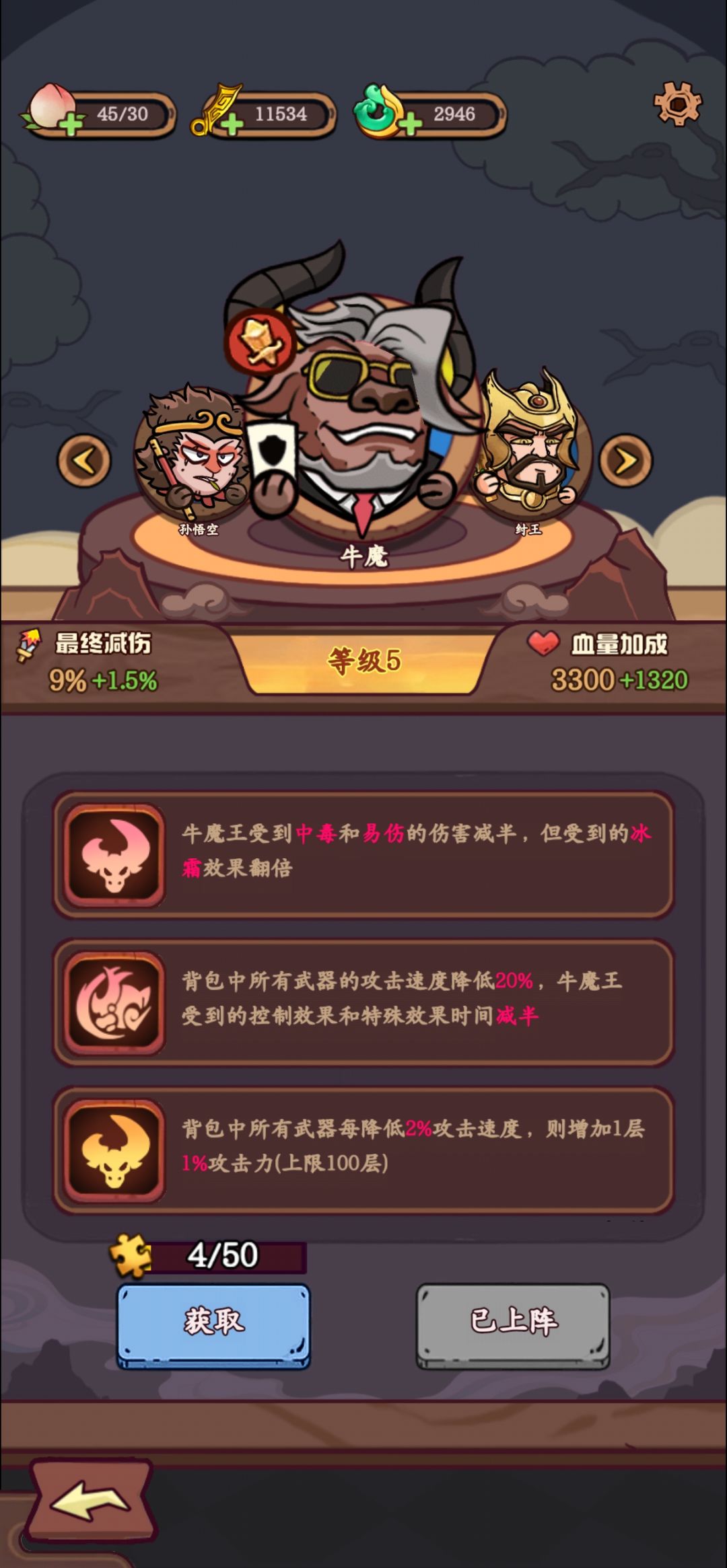 开局抽了3次2000玉武器和前两天商店换的斧头,正常抽人物实际会更快一些。棍子9级应该也是稳过,只是开局要刷脸更多次。 商店选戒指,2棍,3棍,注意点了广告在刷新[表情_捂脸哭],之前亏过2.3次。 pvp好像没有什么奖励可以选择直接不打,毕竟一天10次还是会打很久。 开局领完兑换码奖励,上完装备直接开打,开始几关开局没有卡的地方,熟悉完操作后开始换阵容。 为什么选牛魔,因为牛魔最肉且棍子觉醒强化