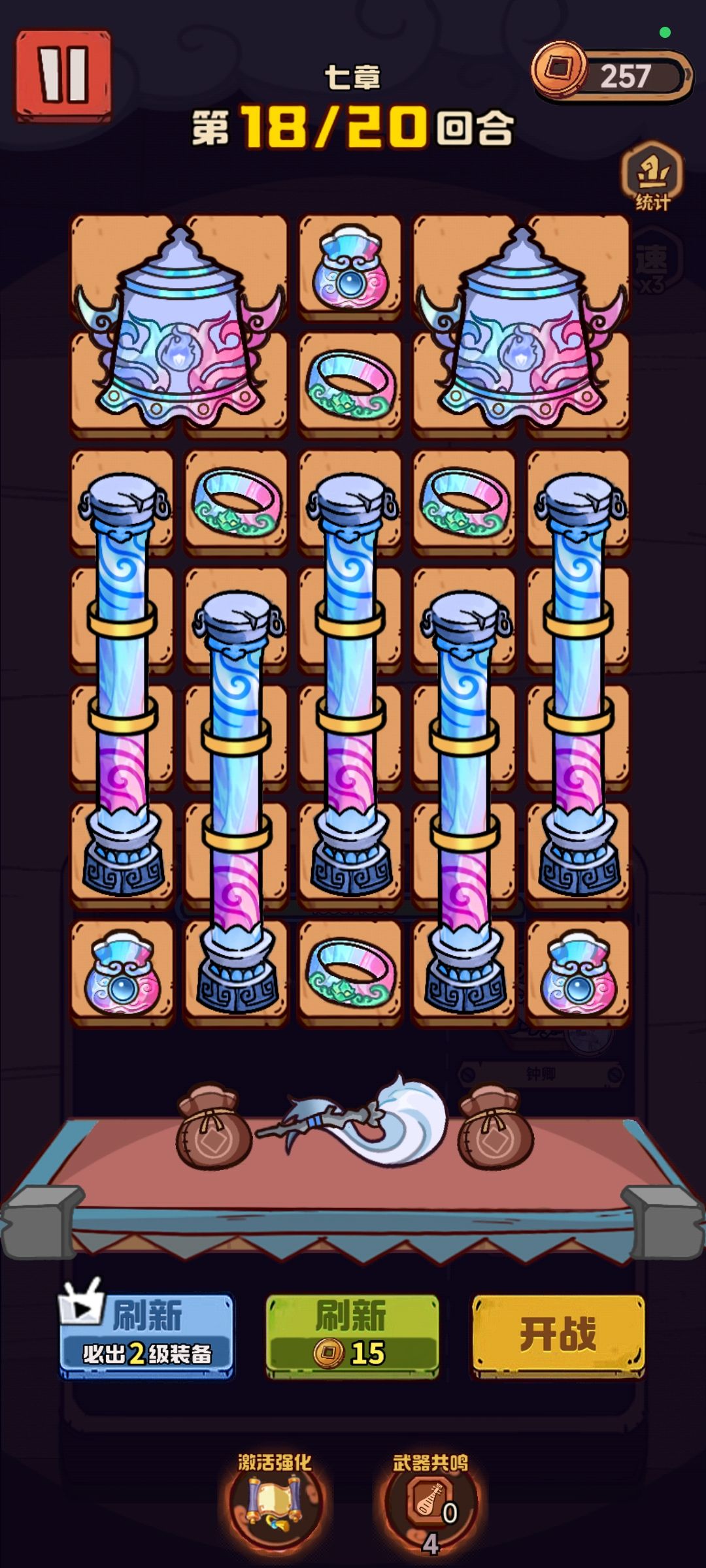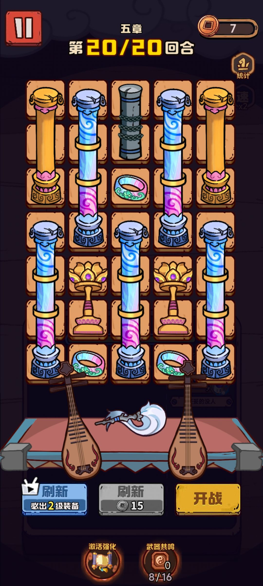 武器: 肯定是主流的琵琶,11级是必要的,然后戒指,灯,钱袋是必带,所以等级越高越好。 灯用绿的,回血高。 戒指用红的暴击,配合猴子打15关那个花比较好打。 带棍子的好处是,如果第一关没有三琴,有个二极棍也是很好用的,因为能打一列,效率会高很多。 剩下随意带。 英雄: 带的猴子,爆伤很好用,得7级才行。 摆放: 如图这么摆就行,5琴3灯最后一关只留一个蛤蟆,剩下全戒指,这样暴击高爆伤也高。 局内技