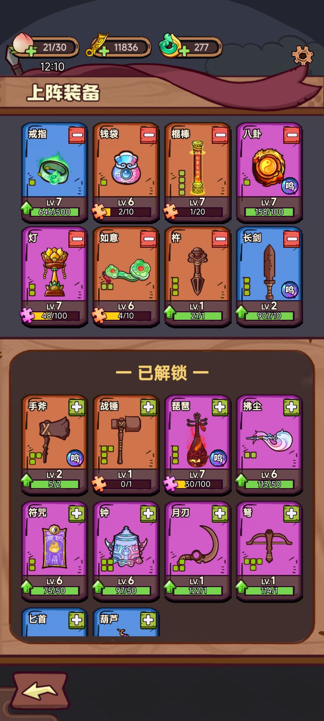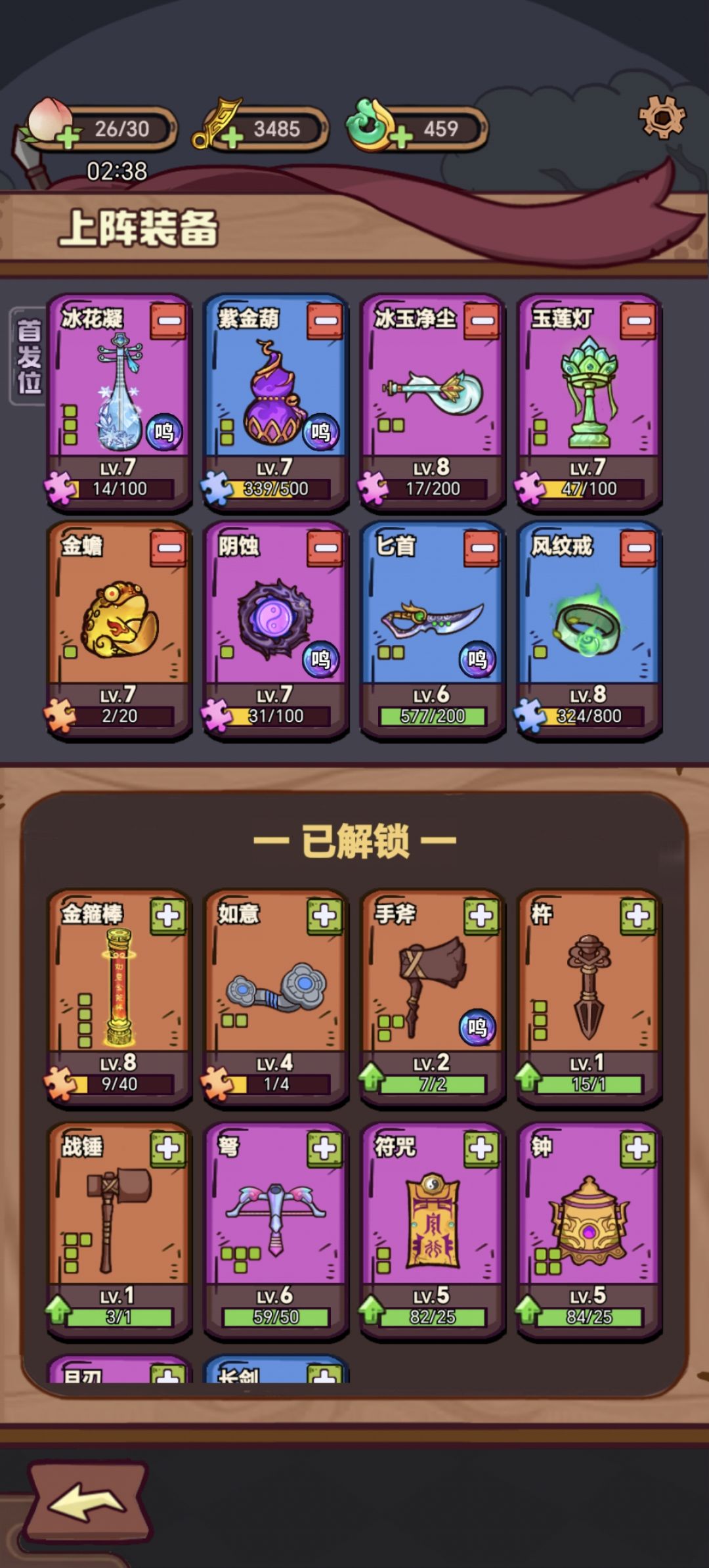 论坛里有很多大神推荐了前期武器选择以及升级策略,不太多赘述,我个人喜欢选琵琶,但是棍棒实在太强,就混着玩。 本人不是纯数据党,只是提供思路,不一定是最优解。 萌新前几章的时候思路可以选剑和棍搭配,本篇主要推荐琵琶和棍混伤。后面还可以把手斧作为主力输出武器的思路。 我目前的上阵武器里,葫芦、灯都是凑数,我最优先升了7级棍子和5级钱袋,然后就是7级琵琶,下一步是把戒指升到7,再是剑。 个人思路就是推图