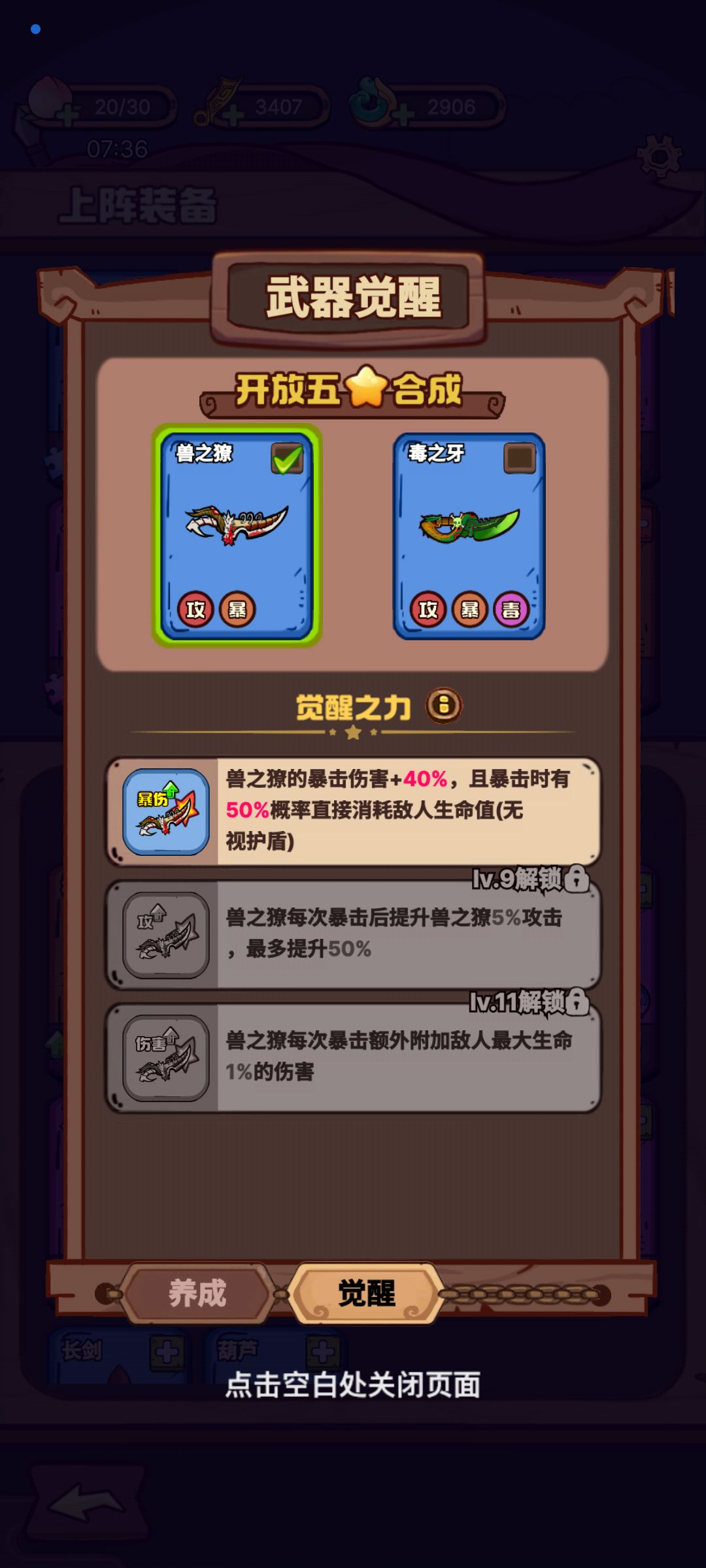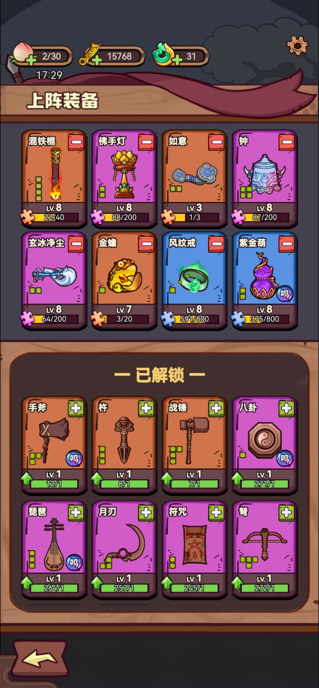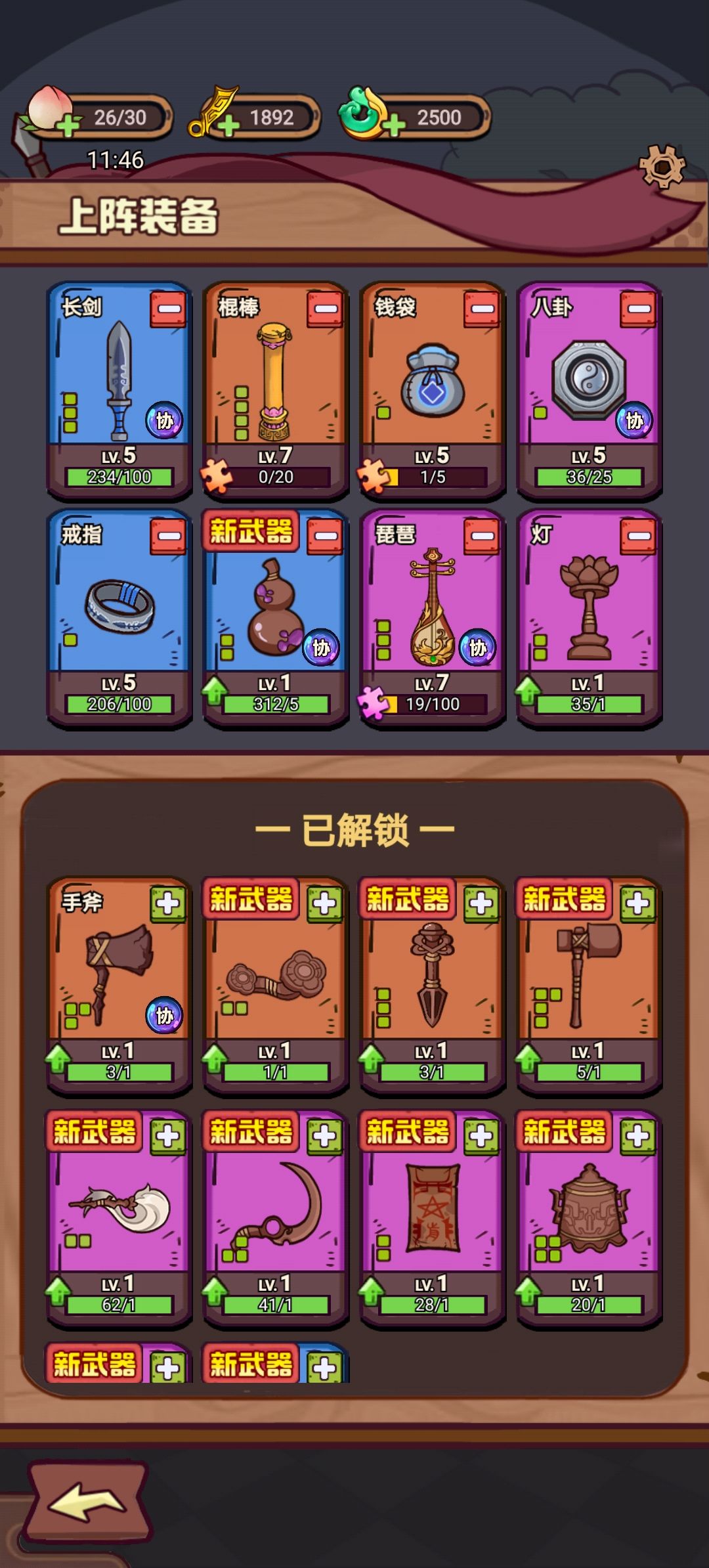 #武器请上场攻略 卡在25一天,调整一下阵容以后,轻松过关,20关以后,如果英雄等级不够,前期很容易暴毙,25关以后后期也容易暴毙,之前的阵容是传统的棍,灯,戒指,八卦,钱袋。其他随便带低级武器,压缩技能空间,但是后面容易被怪物秒了,于是常识加入觉醒飞刀,琵琶,葫芦,都不太行,又用了如意,盾牌,也不行。飞刀,葫芦增加的输出有限,至少7级不太够,盾牌体积太大,卡手,最后升了6级如意,通关。据我的经