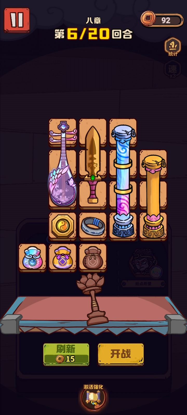 首先放下配置图 英雄猴子 开局被动推荐白嫖或者概率二星 整体思路就是开局挂毒减攻 配合罗汉三秒坚挺 然后配合自己的控制链反杀这里挑了一把不是很顺的对局来做每回合过渡讲解前两回合可以看出弩箭的强势 单体战力基本不输觉醒前的琵琶 这里注意 前两回合基本上会刷到额外格子 这里可以看到 我的摆法 没来锤子之前我就已经决定提前预留锤子的位子 前期摆格子一定要考虑自己武器占格 然后就是取舍 基本上不考虑