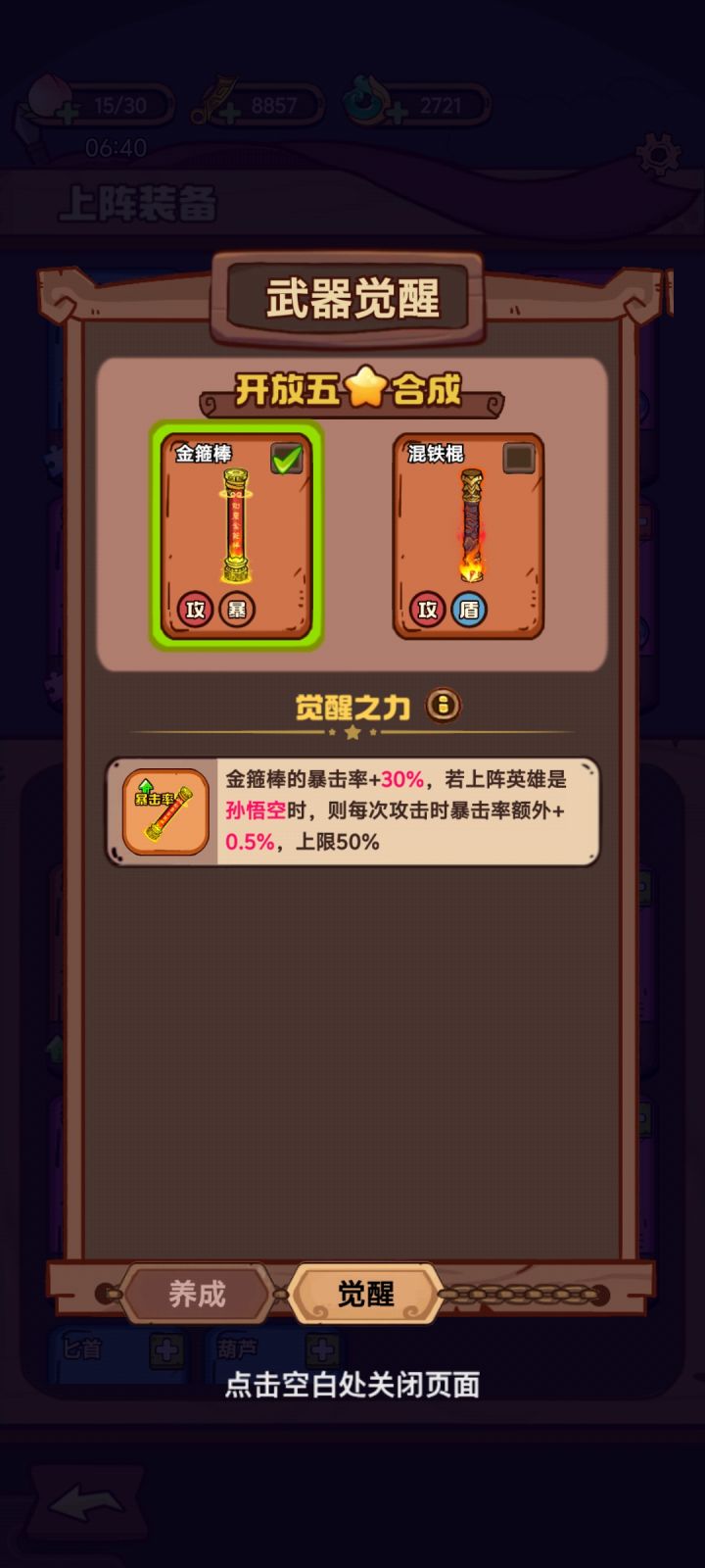 论坛里有很多大神推荐了前期武器选择以及升级策略,不太多赘述,我个人喜欢选琵琶,但是棍棒实在太强,就混着玩。本人不是纯数据党,只是提供思路,不一定是最优解。萌新前几章的时候思路可以选剑和棍搭配,本篇主要推荐琵琶和棍混伤。后面还可以把手斧作为主力输出武器的思路。我目前的上阵武器里,葫芦、灯都是凑数,我最优先升了7级棍子和5级钱袋,然后就是7级琵琶,下一步是把戒指升到7,再是剑。个人思路就是推图