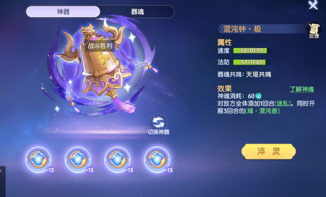 神器出来也四五天了,现在我就神器的一些理解分享给大家,神器分为两个板块,我就分别讲一下: 1、神器: 第一个就是选神器的技能,他会默认让你选相对应的技能,像物理肯定选龙源剑。我就说一下pk的选法,pve就按系统给你的来就行。因为神器技能是消耗一个队伍的魂值,所以要一个队伍搭配着来,目前来看,龙渊剑和混沌钟是用的最多的。龙渊剑只需要40,而且能提速,特别适合物理,能快过封出手,并且触发游龙,无敌。混