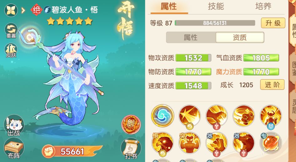 一、主要定位 碧波人鱼是85出战契灵,为6技能(内丹加法器成品为9技能)普攻法伤契灵,专属技能挽海潮声(见技能图)。 目前很多玩家都拿人鱼与凤凰比强度,其实个人觉得人鱼更接近法术伤害的普攻型蛇,都有免伤buff,加上这游戏物防远高于法防,人鱼基本也能像蛇一样对非同攻击类型单位造成一定伤害且具有站桩能力。 二、培养方向 在推荐培养方向前先说下人鱼的面板优势,经同等级同技能同样满气血、物防、魔力资质的