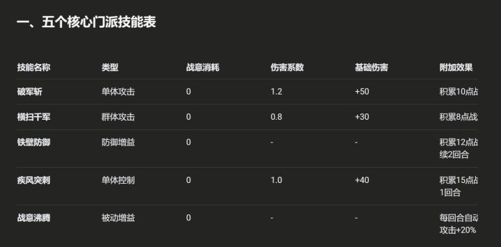 门派定位分析百战-是一个以战意积累为核心的物理输出门派,强调通过持续战斗积累战意值,在关键时刻释放高爆发终结技。核心玩法是"积小胜为大胜",适合喜欢策略性连招和爆发输出的玩家。核心机制:战意系统- 战意值上限:100点- 普通攻击和普通技能可积累战意(5-15点/次)- 战意技能消耗战意释放,威力随消耗量提升- 战意溢出时会获得额外增益效果门派定位百战是一个以战意积累为核心的物理输