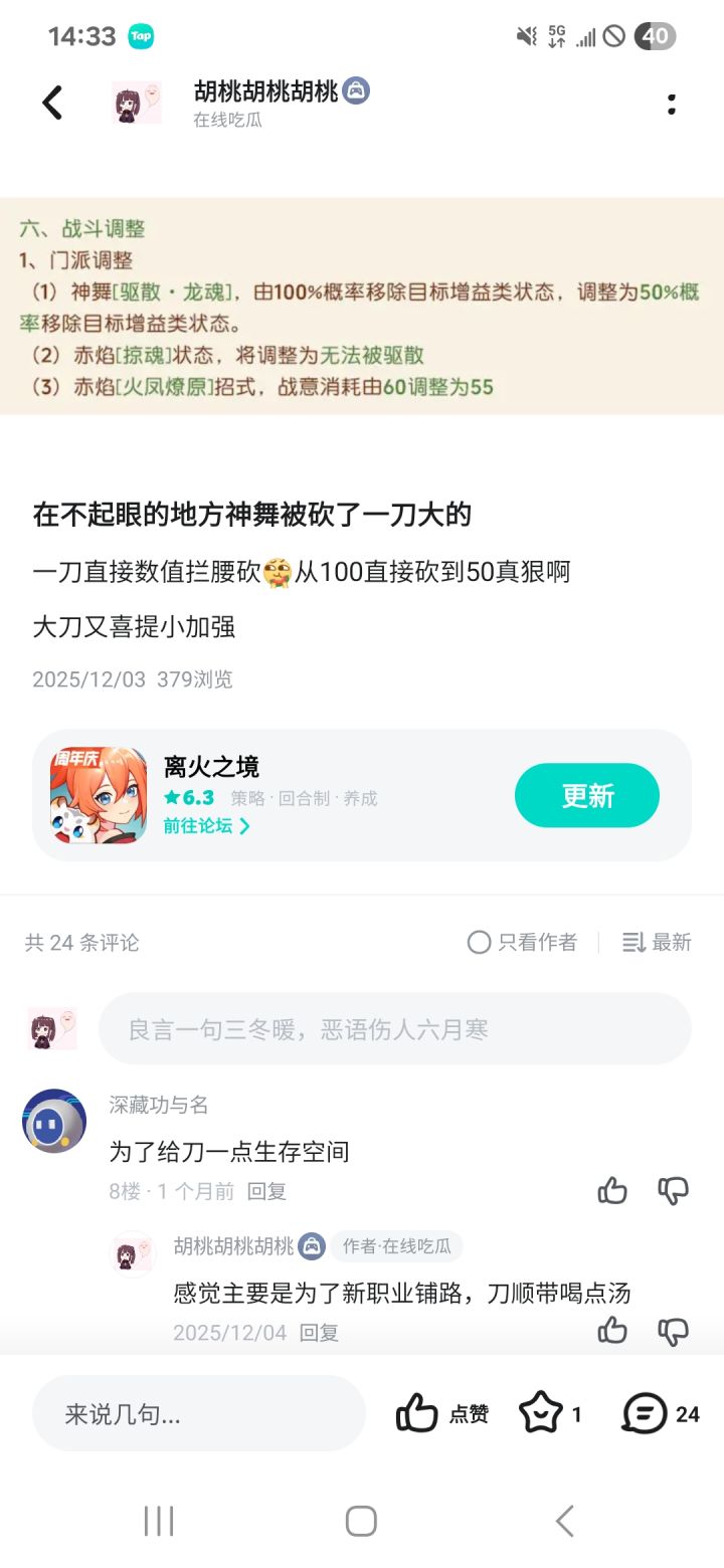 策划真是玩大刀的吧?去年出枪之前的一个小补丁,大刀的掠魂无法被驱散。当时甚至没意识到这是策划下的棋。到了今天,休息状态可以放特技和普攻属于是演都不演了。策划在游戏里也写的很明白了,赤焰的辅助能力更上一层楼,辅助能力么?你一个暴力输出还要辅助能力,你想当六边形战士?另外万灵的总结里,说是给了非菩提身时的减伤还以为是独有的呢,原来拳头的也改了,拳头为什么改?拳头也有菩
