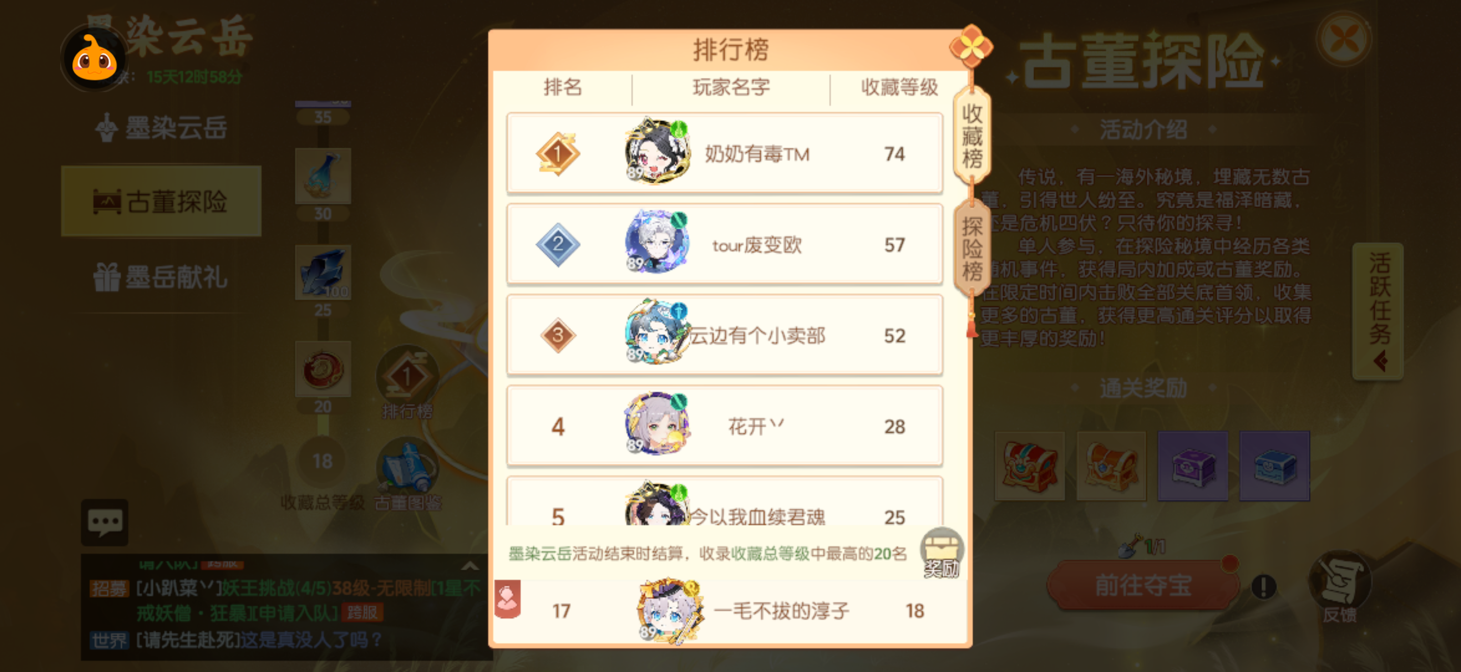 上周更新,古董挖宝又出来了,这次奖励其实有大提升,会产出本源绝,这个出得好可以买好几万绑玉的,所以要打到无双很重要:1、时间问题。挖宝活动总共是15分钟,要想拿满挖到的古董,得在完成活动剩余时间不能为0,所以你得留充足的时间打第三关boss,一般建议留3分半左右,因为你得考虑挖塌的情况。2、神秘巧匠选择问题。优先选加时间的,其次选鉴宝必定成功和猜拳必定成功的,时间充裕的情况下选那个150 秒,
