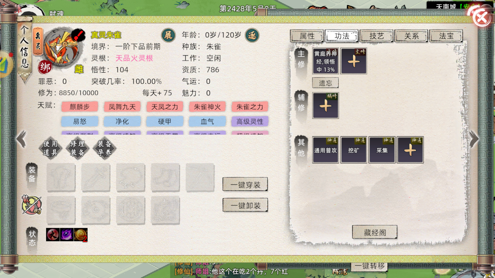 进游戏第一步到处找 聚灵草 摸种子 尽量收集11份,找个隐蔽的地方 打开背包使用种子 疯狂用灵雨书对着聚灵草就行 灵雨术在背包功法里面可学习。炼丹找个40炼丹的弟子就够了!第一次练概率低,第二次概率会增加30%。不递增。进行炼丹! 然后可以苟了。。 升级到练气三层 第二步打主城附近的怪 很弱好打,踩在掉落物会捡起 去御兽哪里卖掉 赚灵石 混沌珠的灵石不可以当货币使用 也可以挖坑去铁匠卖 药物也可以