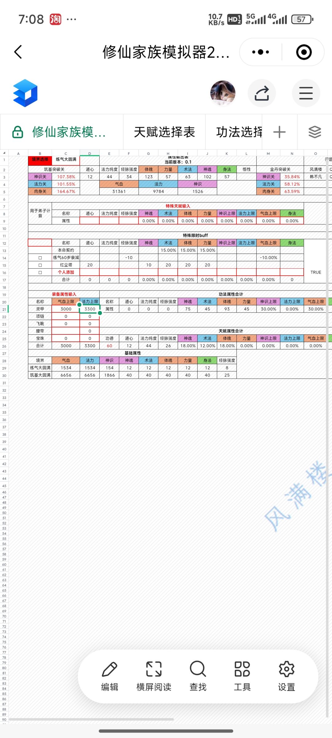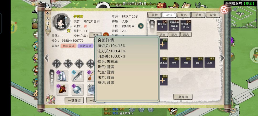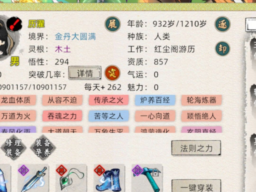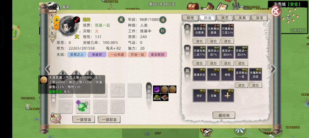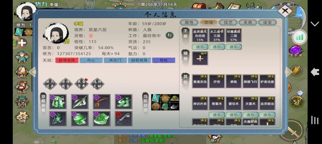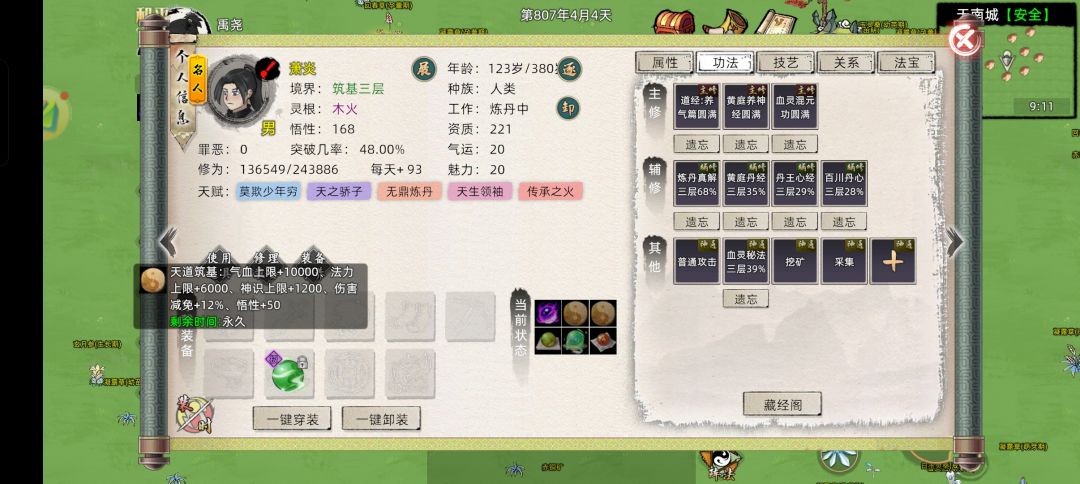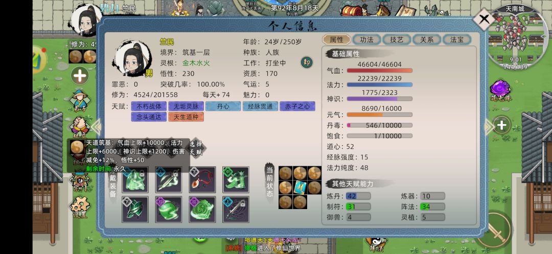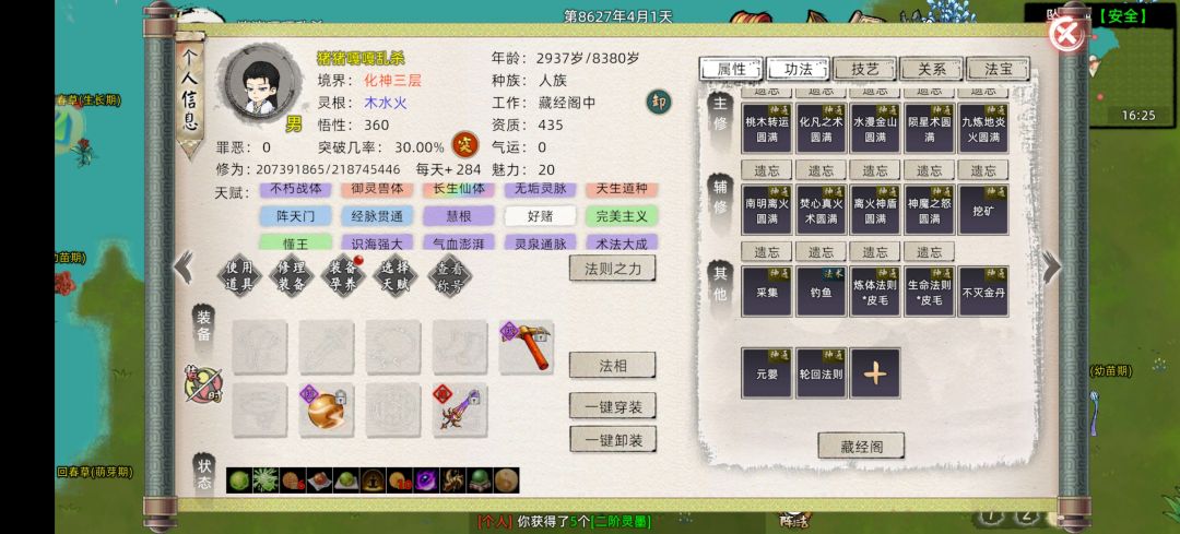 功法: 血灵,九炼,叩魔。(层级: 5,5,3) 外力: 体魄鱼,装备(法力上限总和4000) ,使用四层天魔 身为炼丹工具人,天道筑基性价比不是最高的,但提前弄一套好装备可以为以后省不少钱,也能更省钱的去结丹。 (准备去新区S6,六道修仙界,ID:九尊) #修仙家族模拟器2