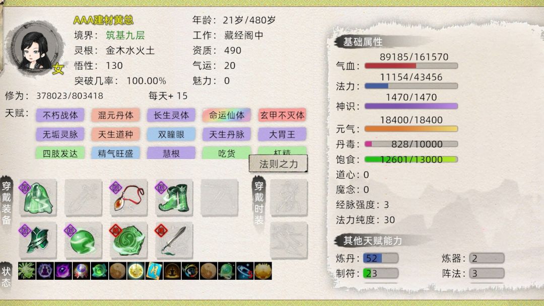 功法: 道经,黄庭,血灵。(层级: 5,5,5) 外力: 体魄鱼,装备(法力上限总和3700) 身为炼丹工具人,天道筑基性价比不是最高的,但提前弄一套好装备可以为以后省不少钱,也能更省钱的去结丹。 (准备去新区S6,六道修仙界,ID:九尊) #修仙家族模拟器2