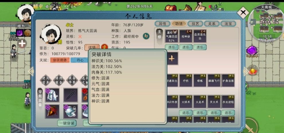 /任意单灵根,天赋:御灵兽体、天生道种、无垢灵脉、经脉贯通、丹心。 功法:两本三阶神识,一本三阶炼体,全部三层即可。 加上本命灵兽加成轻松天道,而且不会卡功法进度,一年进入筑基期。 (图示为无灵兽出战、未服用体魄鱼、装备非顶配时的成功率)