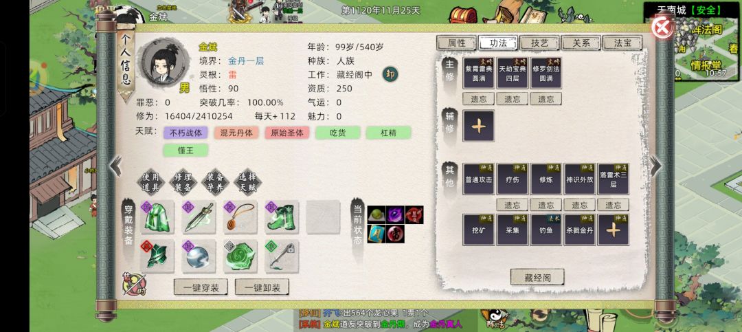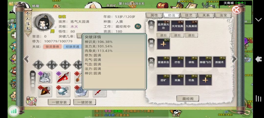 金丹3层加月卡加木鱼一共88天赋 天赋选择御兽灵体,天生道种,慧根,天生阵心,丹心,精气旺盛,钢筋铁骨,无欲无求,好赌。加成能到 灵根选火水 然后法灵筑基10点功德选择长生灵体(法灵筑基负面效果是减少百分之50的法力上限,对体魄和神识没有影响所以筑基功法只要4层差不多3关都是90以上了) 这样一来天赋加成能到体魄32%,术法没有,神魂54% 功法选择筑基前九练,化龙,天河,筑基以后天河换成叩魔。 外
