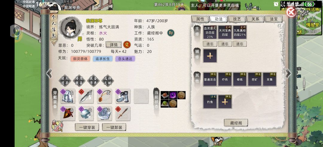 60岁后需要三本功法都修满,60之前需要魂,体修满。装备一套极品不需要额外法力或上品带几百法力,因为60岁之前修不满,修满了又不需要。不介意用,非常耗时间,需要四五天才能筑基