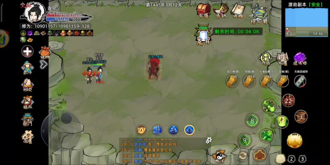 功法 乙木 血灵 黄庭 ,用丹前16万血,最后加雷劫总共用了五六十张玉清,120多回春,几十张剑盾,17张风行,50颗下品元气,用不动如山的时候才有空按符 核心,乙木,不动如山,血灵,黄庭,没有的话需要自己掂量下
