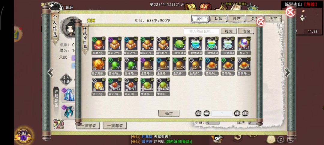 结丹到元婴,先三关,后心魔,再雷劫! 论坛说的符都准备了,但是完事发现符点不了几张,就玉清废的多,差不多消耗了两百!不知道是不是因为黄庭,神识丹消耗也不多,就几颗。消耗最多的是元气丹!70颗元气丹基本用完了,渡劫前设置元气下降自动吃元气神识血蓝,多准备元气丹,我的是心魔没有雷劫伤害高,后边雷劫就是40多秒就得放一次血灵!靠元气丹保命!然后是混沌珠一些升级!哦对了,巨兽也遗忘了,不遗忘进去会有个巨兽