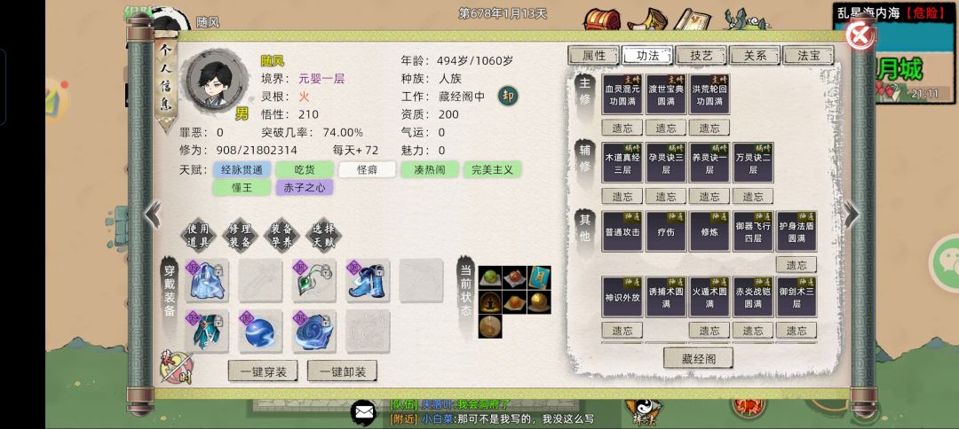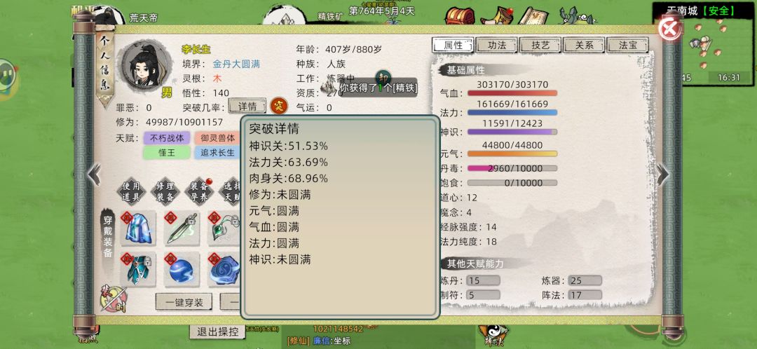 这是第二世结婴,还好吧截图留下了 如图 我们可以看到这三关分别六十个大概 首先不去计算道心经脉法力这些,就简单来说 这个三关属性吃下品丹能到神识七十多点其它俩项九十多点,这也过三关失败了俩次这老登套路懂得懂得就不多讲!!! 有大量灵石或者看得懂融合的道友可以玩其它元婴,看不懂的就走这种最简单结婴! 结婴相对于来说简单,道友常说的那种三关一过就洒洒水啦!心魔就那么回事卸载一切能有伤害的就