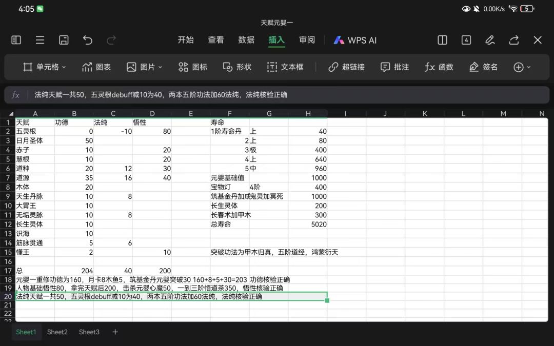 此路线只计算了血海金丹40体魄加成,其他的加成请自行计算,适合多灵根,其他灵根看清功法的属性加成 金丹大圆满基础五维100 力量100➕功法84➕20术法鱼 体魄100➕功法60➕40血海➕10体魄鱼 术法100➕功法60➕功法60➕20术法鱼 神魂100➕功法60➕功法60 大道加30%力量术法 本命加15%力量术法体魄 力量300÷204≈1.48-0.45需要3%天赋 术法300÷240=1