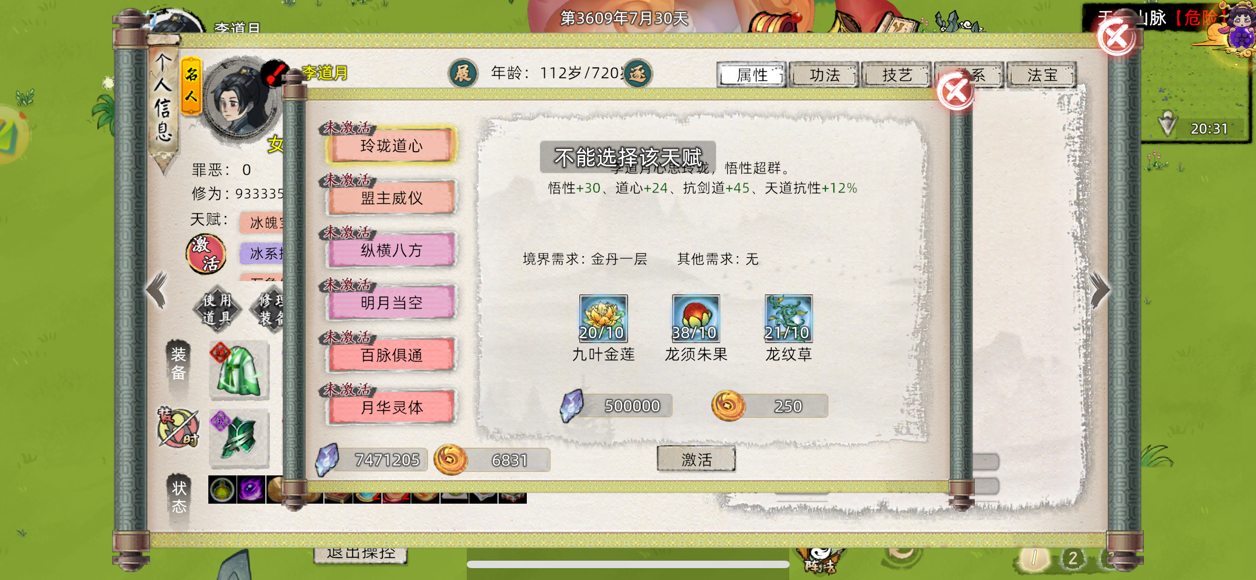 第七世:开始真正的修仙了,这次不知道能到达何种境界。 52功德天道筑基 灵根:火木灵根 天赋:御灵兽体、念头通达、丹心、经脉贯通和无欲无求,念头通达必须在开始界面选,其他的随意。 功法:九炼真经(5层)、血灵炼体(4层)和南明蕴火决(4层) 其它:再加上体魄鱼和本命灵兽加成就可以天道筑基 天道筑基需要的都准备好了,接下来就看怎么走了。 果然路途艰险,今天算天机,还差1400法力,还好小康道友有2