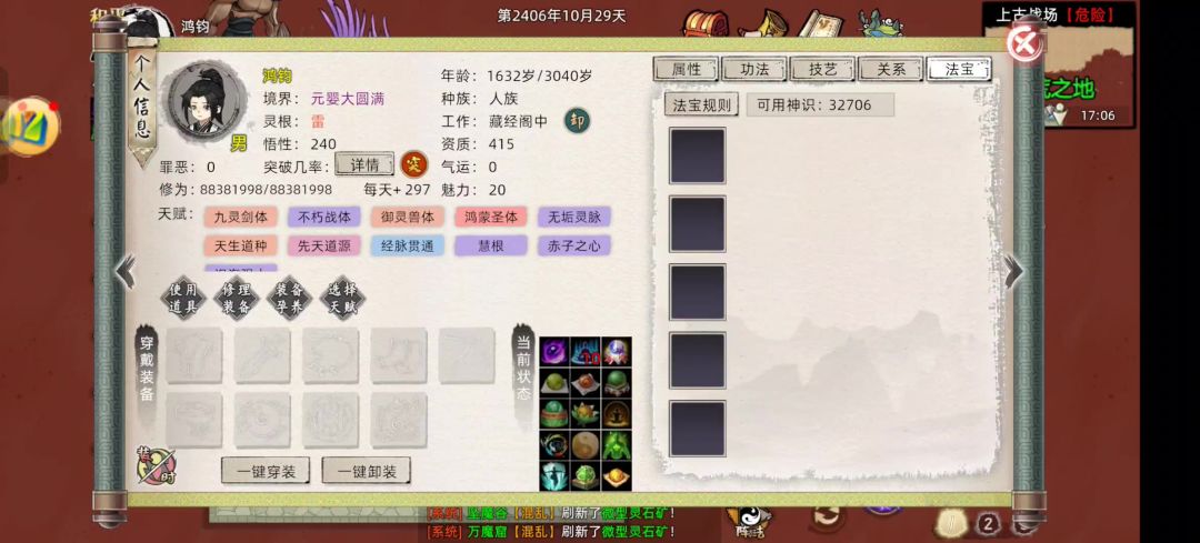 1.法穿100 2.当时我的常驻攻击86000 3.吸血我是一个血海金丹,我的天道筑基是为了功德 4.进去前叠了60张绝品风行符 5.绝品玉清符准备60张 6蓝药血药吃的极品(杀完感觉蓝血上品也可以过 ) 7主修如图 8.技能主要的是化凡,神魔,阴阳,离火,水漫金山,金耀,均为五阶,要有两套输出搭配确保输出没有空档期,输出技能选择瞬发倍率高的 这一套很容易过,关键点在于化凡,神魔,离火,水漫金山,