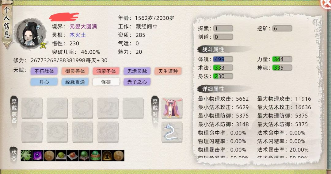 此修行路线为天道筑基,血海金丹,万道元婴,圣体为99功德阴阳,比较极限,若法灵筑基,或圣体选50功德道尊会更为容易达成。 法则要求1000术法,60000攻击 元婴大圆满基础术法230➕万道100➕两本攻击功法120➕一本五级道经75➕术法鱼20=545 1000÷545≈1.84需要84天赋-本命15=69%天赋加成,阴阳圣体➕剩下所有术法天赋可以达到73那么术法达成 攻击以图一为例结丹结婴均无
