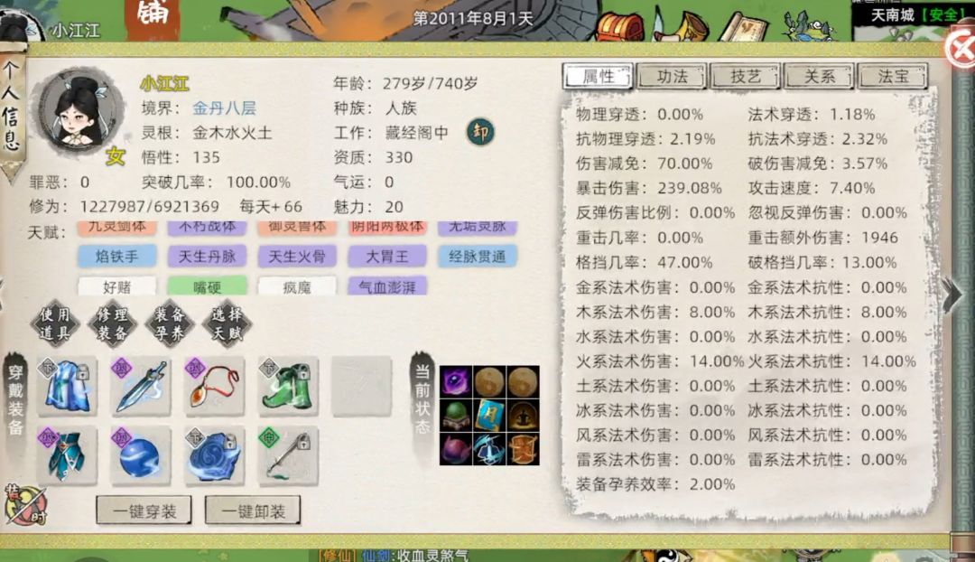 灵根:木水火5 天赋:御兽20,念头通达10,丹心5,经脉贯通5,追求长生5,懂王2 主修功法:血灵4级,天河4级,九炼5级 功德花费:52点 功德获取:筑基6层(42),月卡5,木鱼5,共52点装备需求:难度不大,需要吃鱼 天道筑基的20点属性换不朽战体和无垢灵体, 结丹需求:下品结金丹一枚 结丹三关:没有装备需求 渡雷劫说困难也简单,多买点回春符,设置好自动喝红喝蓝的保护,抗不住了就用回血技能