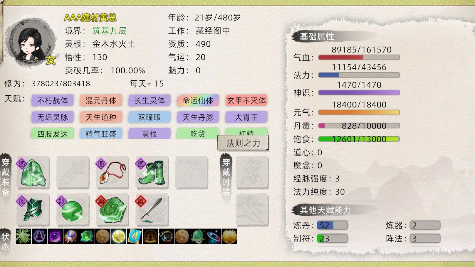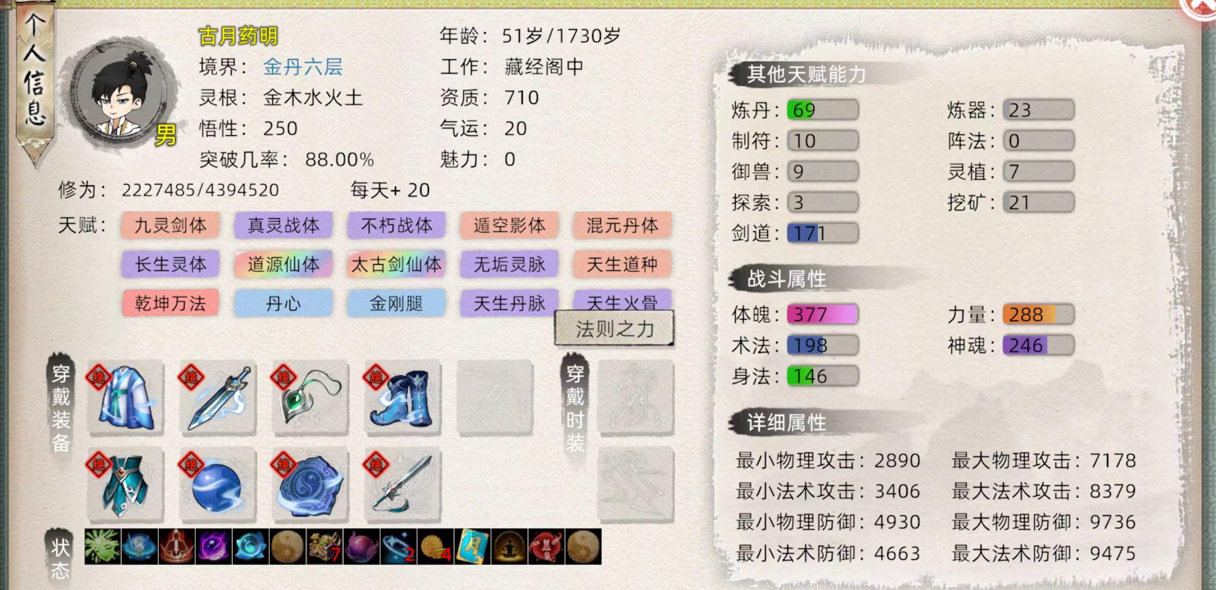 此修行路线为天道筑基,血海金丹,万道元婴,圣体为99功德阴阳,比较极限,若法灵筑基,或圣体选50功德道尊会更为容易达成。 法则要求1000术法,60000攻击 元婴大圆满基础术法230➕万道100➕两本攻击功法120➕一本五级道经75➕术法鱼20=545 1000÷545≈1.84需要84天赋-本命15=69%天赋加成,阴阳圣体➕剩下所有术法天赋可以达到73那么术法达成 攻击以图一为例结丹结婴均无