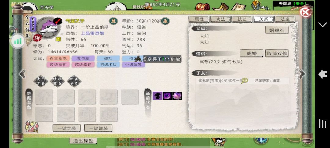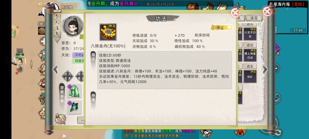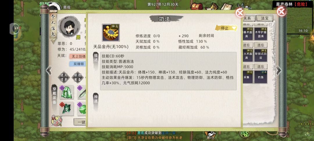 #首测 金丹攻略# 从八月三号12点开服到今天八月六号12点达到首测大境界上限刚刚好三天。 我应该是首测玩家第一个金丹吧,能够升级这么快主要还是丹毒系统不完善,可以嗑药快速提升。 废话不多说了,直接上攻略。 结丹和筑基的突破差不多主要就是堆 神识 法力 肉身 。多学一下增加相对的功法就行。 然后就是装备了,尽量穿最好的装备。装备也会增加这三个属性,而且加成还比较高。 大家可以看到我的装备并不是很