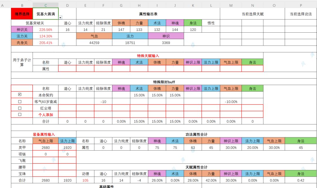 天赋,乾坤,千符,长生灵体,探灵手,单火,筑基功法,选择化龙,九练,扣魔。化龙技能学满百分之20体魄,扣魔技能学满,百分之25术法,队友带个大道同心决,技能满百分之30术法,魔灵筑基,4维加20,鱼10体魄,最后一共是,体魄,133,术法105,神魂150。然后技能天赋,宠物加成,体魄加成百分之61,术法百分之102,神魂百分之40。算完之后体魄214,术法212,神魂210。剩5点功德#修仙家族