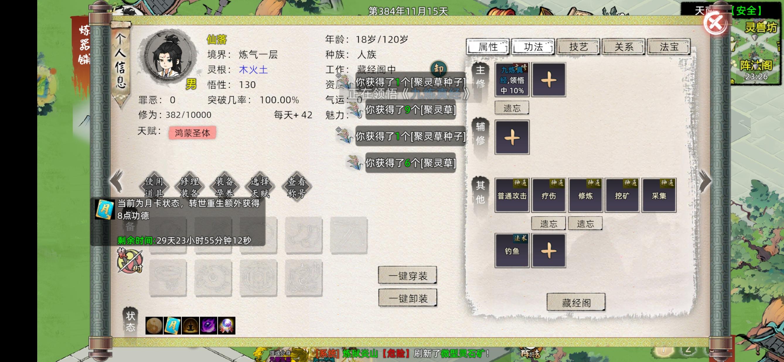 大家伙轮回结束之后,精益求精的人,肯定会选择再拿一个永久效果的剑心(50剑道,50道心)轮回之后,大部分人都处在资源积累期,重修资源已经耗尽,下一世资源还未攒齐,那么在化神1-3的时间就刚好够平民玩家完成下一辈子的原始积累。那么从时间线上来说,化神3重修走剑心是最佳的。剑心是通过化神结剑道法则取得,剑道法则要求是400剑道,所以咱们凑条件的功法,天赋,特殊金丹元婴,辅助道具,都是围绕着剑道。