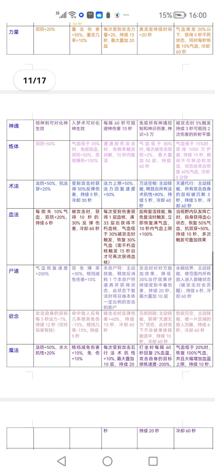 原先数值在上面图里,,1.雷掌握:抗双穿30%→20%(小削弱)2.阴皮毛:命中-40%→-10%(大削弱)3.阴圆满:每60秒回复3%法力→回复6%法力(中幅加强)4.阳掌握:额外闪避+50%→30%(中幅削弱)5.阳大成:治疗效果+200%→300%(中幅加强)6.阳圆满:每30秒回复3%气血→回复6%气血(中幅加强)7.剑道圆满:抗剑道+100,剑道+100,主动技能释放期
