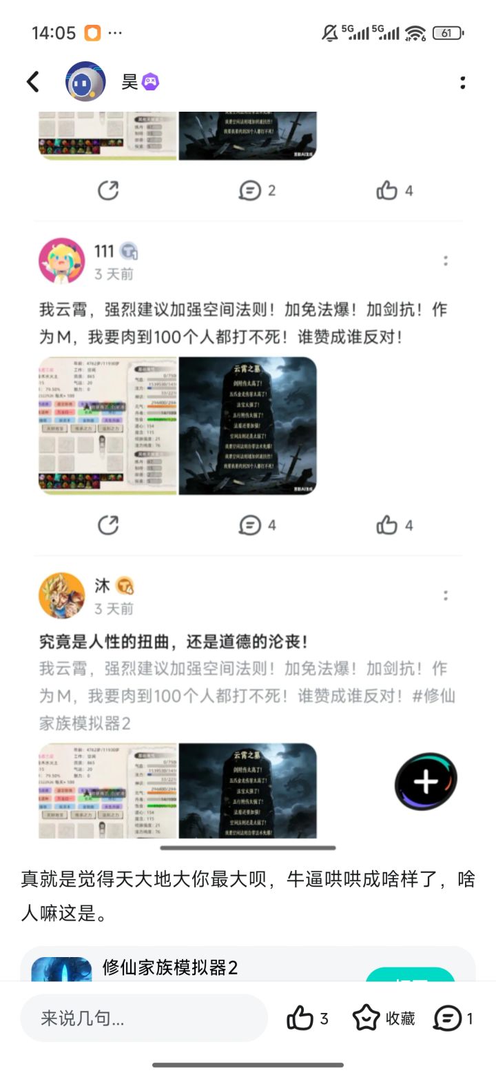 你会刷bug吗?我是真的不会,只不过收到了bug的产物,当时并不知道。遇到什么先别什么脏水都到处乱泼造势,你们楼外楼宗门好几个道友也是典型了这一点。在昨天我账号异常的时候我就去联系客服了,客服也给了我明确答复,我也看到最近论坛累计冲值额度我才知道自己已经累计78848 我有必要去刷bug吗?还有老登已经开放过除了活动气团和每天固定夺宝外一段时间天材地宝大量获取的途径,只不过在灵界你们宗门绝大多数人都是只会在安全区打坐,又有几个人能够出门吃资源?