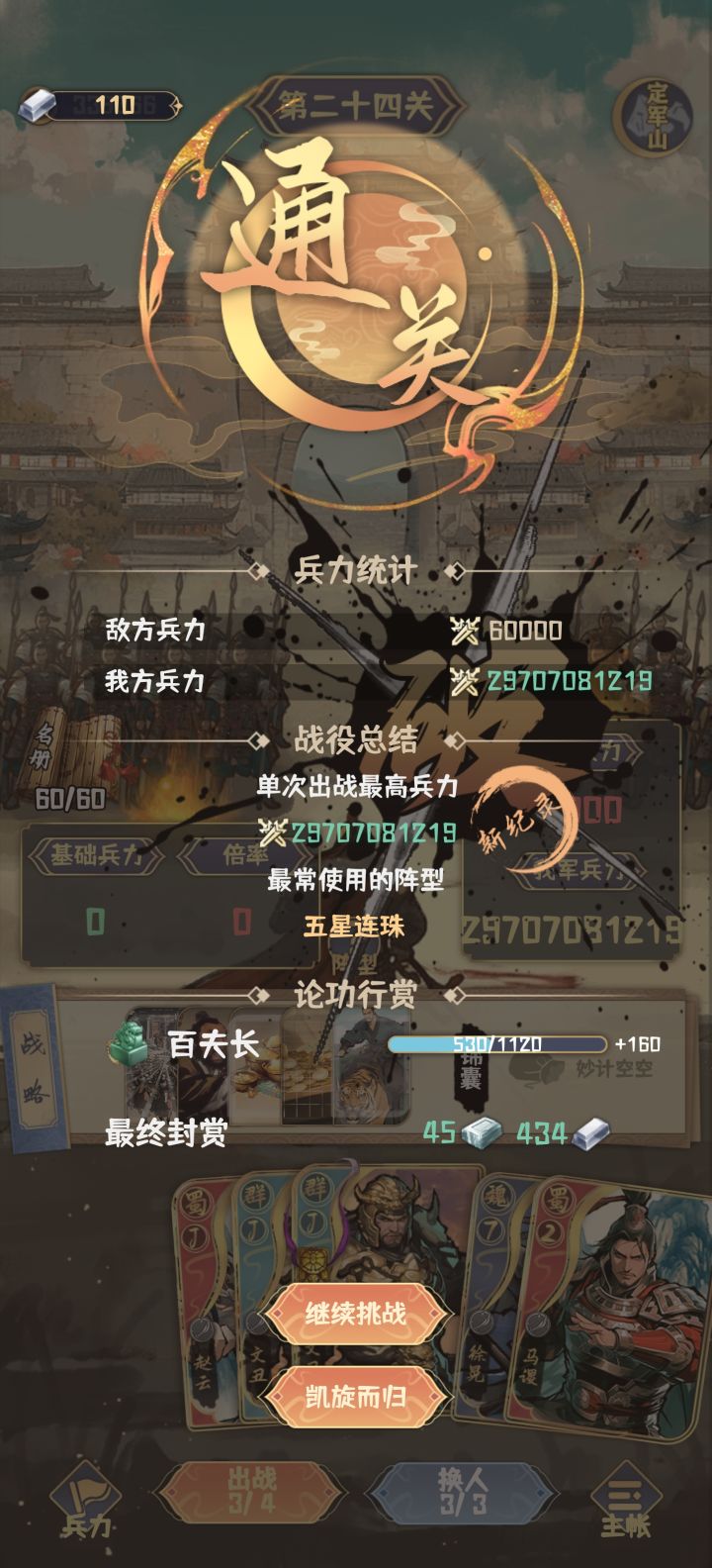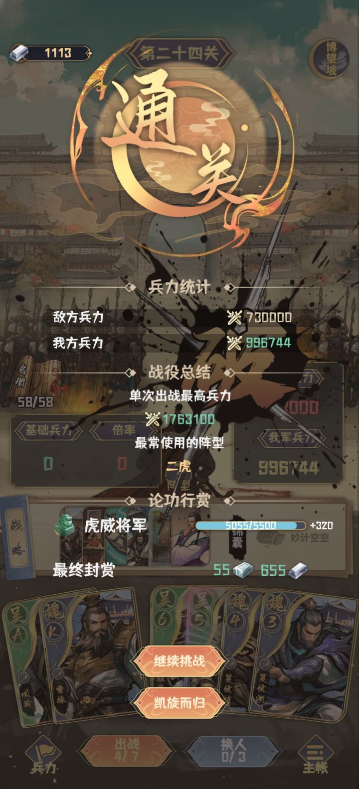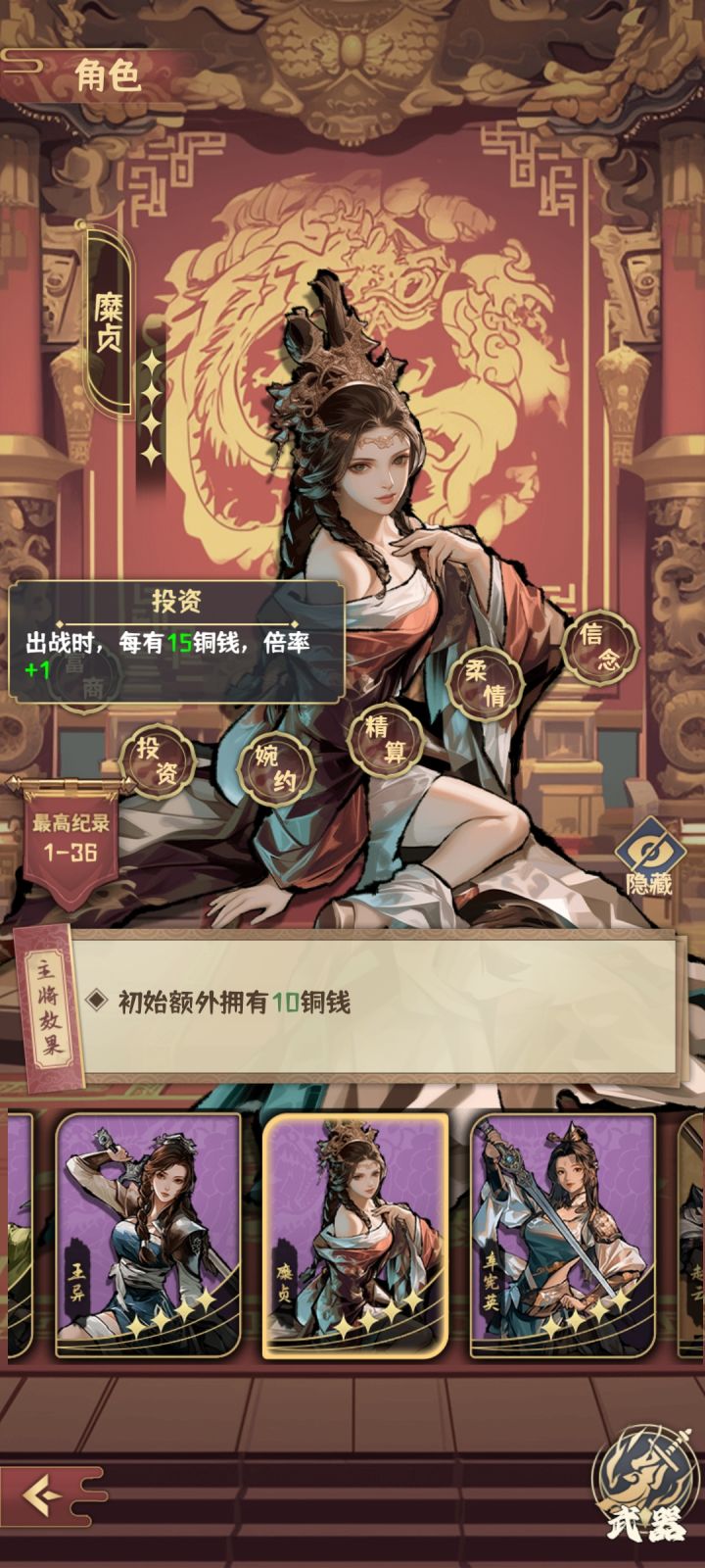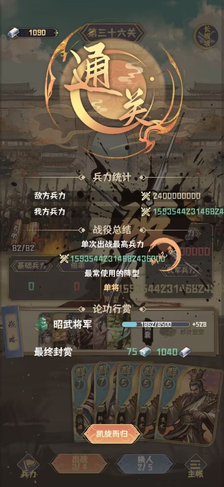 其次:阵容搭配如下,武将是糜贞满星(我心目中的最强紫将,打钱yyds),武器是方天画戟精炼满星强化21级,玩的经济流,后转大帅流,开局顺所以分高,但应该还有极限。