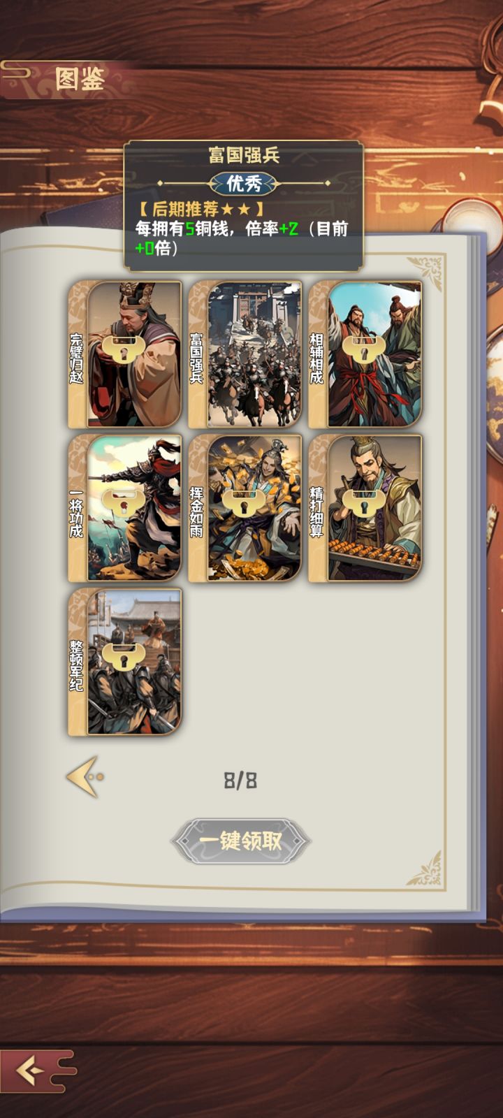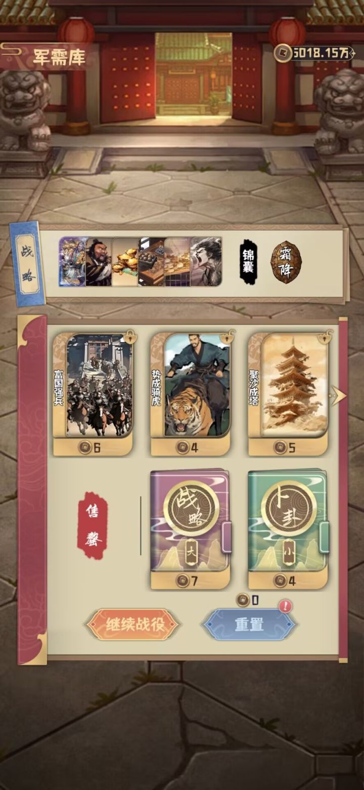 思路:前期随意嫖牌,100块以上可以开始刷战略(记得有个刷新给倍数还是兵力的来着,可以拿,但是后期换倍数乘法战略),我习惯刷到刷新10块以上就停手,个人习惯,没有算过收益。俺也一样放利滚利前面,吃两次,富国强兵和富可敌国是刚需,左脚踩右脚螺旋升天,推荐中期杀鸡取卵+如法炮制清理牌组,人心所向来得早可以转大将流(但强度肯定不如大帅流),不然就是杀鸡取卵配虚张声势一直吃到35波结束,卖掉利滚利和杀鸡取卵,俺也一样位置放倍数乘数更高的前面。