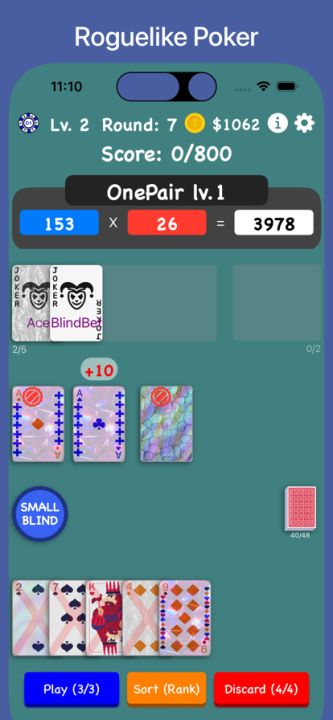 每一轮你只有有限次数的弃牌和出牌机会,每一种牌形都会有不同得分,配合几百张小丑牌和各种功能牌,可以组合出不同的高分;