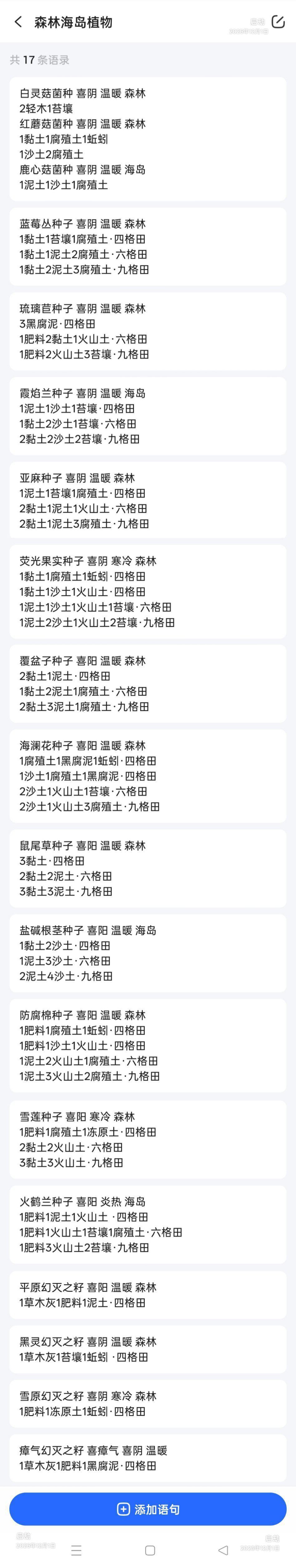 喜阳(农田上方没遮挡物)喜阴(农田上方有遮挡物) 温暖(大部分地区都是温暖)寒冷(雪山) 森林(种子获取沃维森林)海岛(种子获取巴利群岛) 两格田不要造,收了不返种子 不想浇水就等下雨的时候把家收起来再放出来 不要在下酸雨的地方把有农作物的田放出来 不要用海水.酸水浇灌农作物 这边的排序是我按把种子放田里(全部种子都在包里)的时候哪个在最上面(优先写阴)就先写哪个 白灵菇菌种 喜阴 温暖#荒原曙光