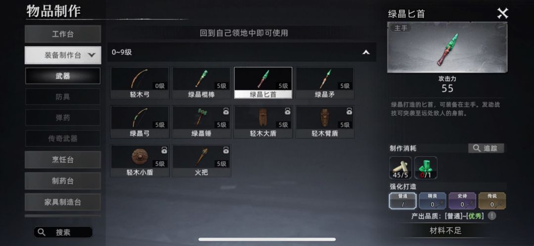 一、核心玩法 收集材料:玩家需要在游戏中探索不同的环境,收集各种生存所需的材料,如木材、石头、兽骨等。 打造工具:利用收集到的材料,玩家可以打造出各种求生工具,如石斧、石刀等,提升自己的生存能力。 技能提升:通过不断使用和改进工具,玩家可以提升自己的锻造技能和其他生存技能。 营地建设:玩家可以选择合适的生存区域,搭建求生的庇护营地,并随着资源的积累和技术的提升,升级营地中的设施。 联机生存:游戏支