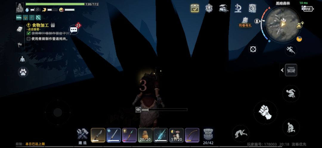 玩家编号:178003 故事: 黑暗森林有神秘的矿石:黑水晶,位于山崖边上,有怪物驻守,当玩家靠近矿石时会进入黑暗环境,伸手不见五指的情况下,不知道周边有多少怪物在虎视眈眈,直到被攻击后慌忙逃命坠入悬崖.... 攻略:人物自制火把可抵御黑暗环境,在有照明的环境下把怪物击败,就可以放心的采黑水晶了#荒原曙光手游
