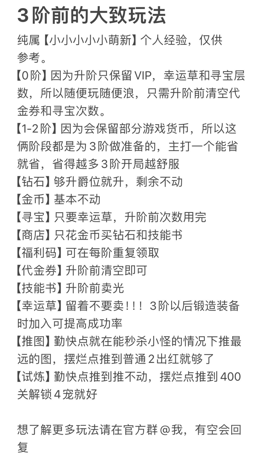 因为很多人不知道升阶什么时候升,或者要不要纯资源啥的,这里一一解答 重点礼包码每次升阶都可以用一次,大家别忘记 三阶之前升级最重要,其它都靠边。 0阶可以直接在简单VI一刀秒,到400级进1阶 (0阶爵位升到伯爵就可以不用升了全抽宠秒怪) 1阶在简单IX一刀秒到500级进2阶 (1阶爵位可升到侯爵) 2阶在普通II一刀秒到600进3阶 (钻石最好留着,毕竟能保留50%进3阶有几百万钻石开局能玩的比