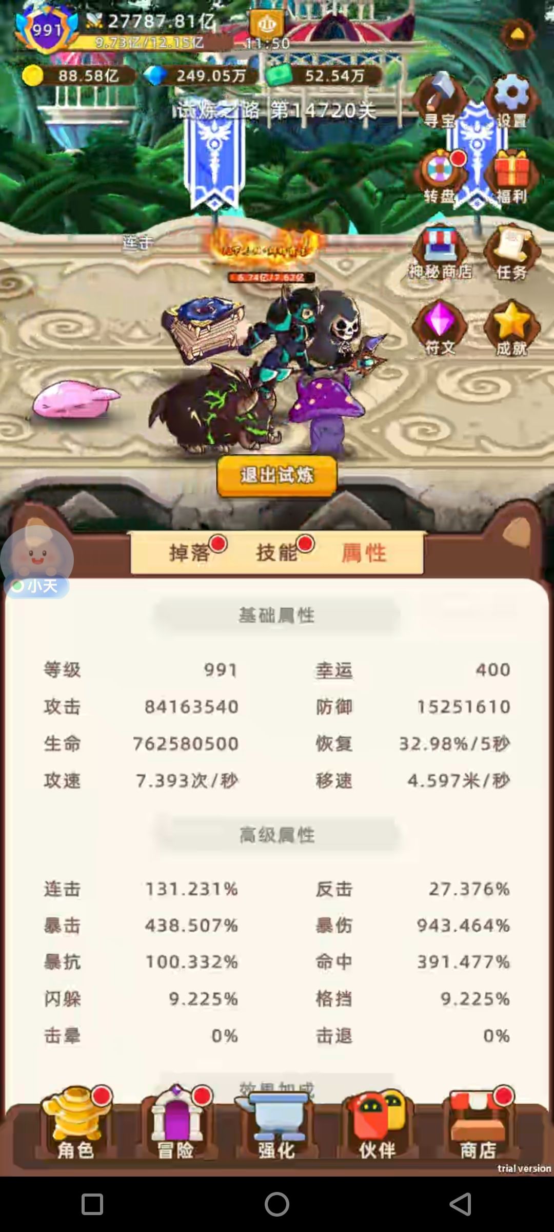 算是半通关可以养老了 以前神罚就通关了现在新增了很多 神罚之前论坛里有就不写了 神罚-星河倾覆-诸神无限-永夜降临-末世审判-乱世浩劫-宇宙崩解······ 往后应该还有很多 但到宇宙崩解宠物就不会出橙宠了 推图几乎没收益了 往后就是刷试炼到700%的掉落加成也就毕业了 通关需求数值 各加成7700%左右 属性讲解 100连击之后就没用了 反击收益还不错 但别的数值需求太高了没他的位置了 暴击45