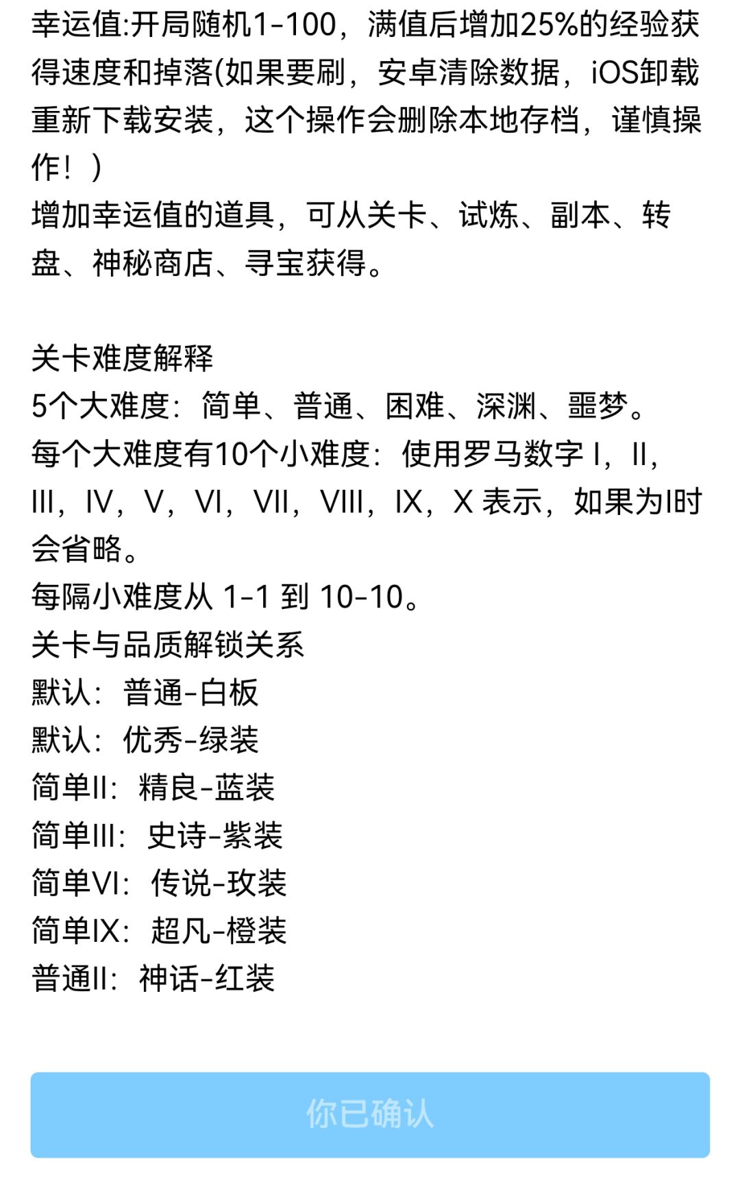 开局一定要刷幸运值,80左右就差不多可以开局了。幸运值:开局随机1-100,满值后增加25%的经验获得速度和掉落(如果要刷,安卓清除数据,iOS卸载重新下载安装,这个操作会删除本地存档,谨慎操作!) 增加幸运值的道具,可从关卡、试炼、副本、转盘、神秘商店、寻宝获得。 关卡难度解释 5个大难度:简单、普通、困难、深渊、噩梦。 每个大难度有10个小难度:使用罗马数字 I,II,III,IV,V,VI,