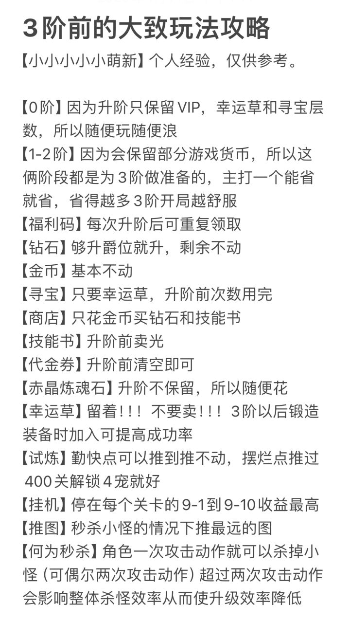 1.刷怪速度很重要!经验获取主要是等级影响跟地图难度关系很小,不建议极限推图,前期提高品质可以推,刷怪速度直接影响资源获取速度!!!2.免费钻石广告尽量多看,算是额外增加点收入,神秘商店技能等级都有200开始,购买金币能买的一切物品,技能等级用余下的金币随意升点就行,后期金币不缺3.属性搭配优先级 连击-暴击-爆伤-命中-闪避-反击-格挡 其中命中达标就行,普通二以下101合格,困难110合格