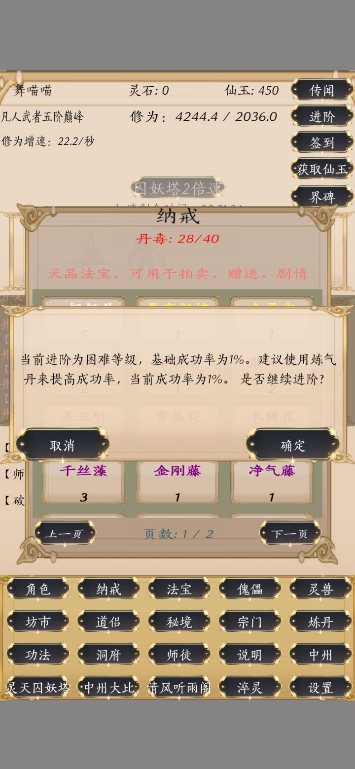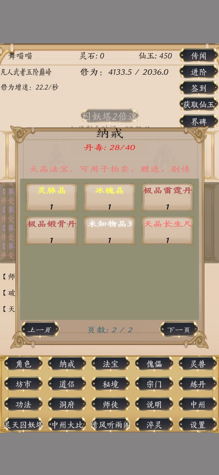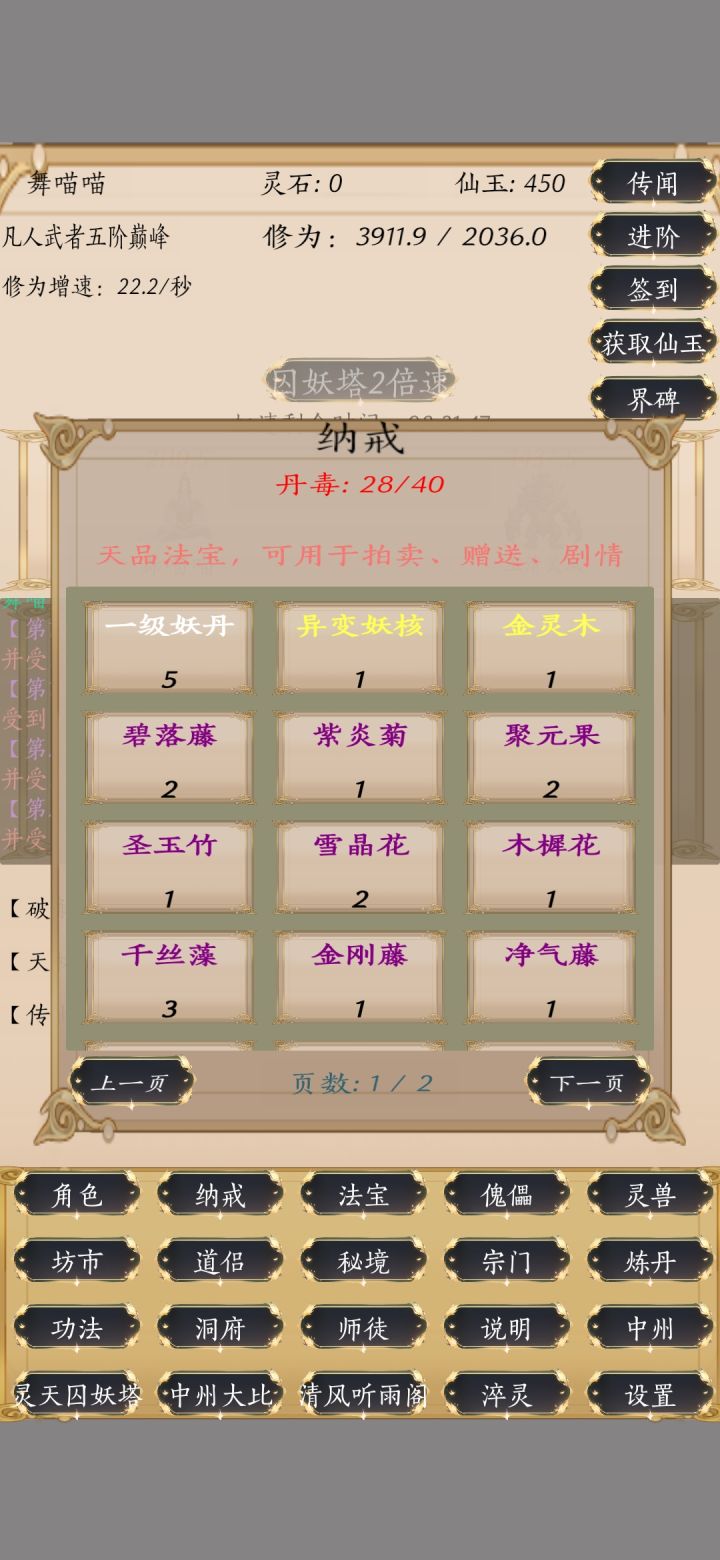 总体体验还是不错的,每天登录慢慢刷的话还是可以玩的,找大佬换换极品,每天自动清清丹毒,强烈推荐增加攻防血的属性丹药,还有法宝只能升级灵宝灵甲灵符灵戒,这个希望装备可以改良一下,装上那些刷来的法宝,刷来的法宝只能卖灵石感觉没啥子用