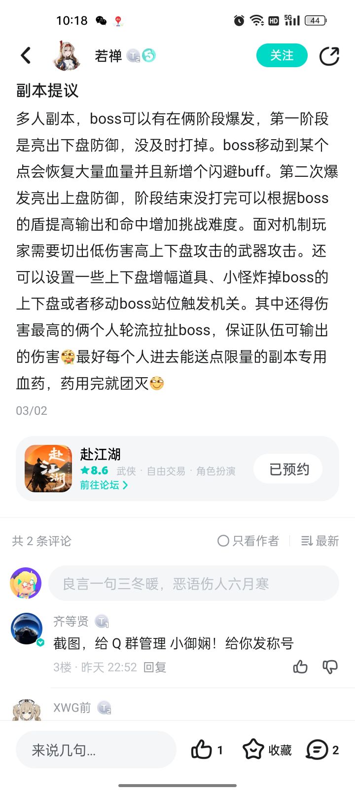 赴江湖真好玩,游戏风格很好,玩法狠多,到现在玩了有20多天吧,就是小些毛病吧,官方也都在积极处理,也期望后续内容更丰富,祝赴江湖越来越好,期待2测#赴江湖 #赴江湖手游 #赴江湖领码 #与君共赴江湖 #赴江湖江湖首测 #赴江湖技术 [表情_点赞][表情_点赞][表情_点赞]