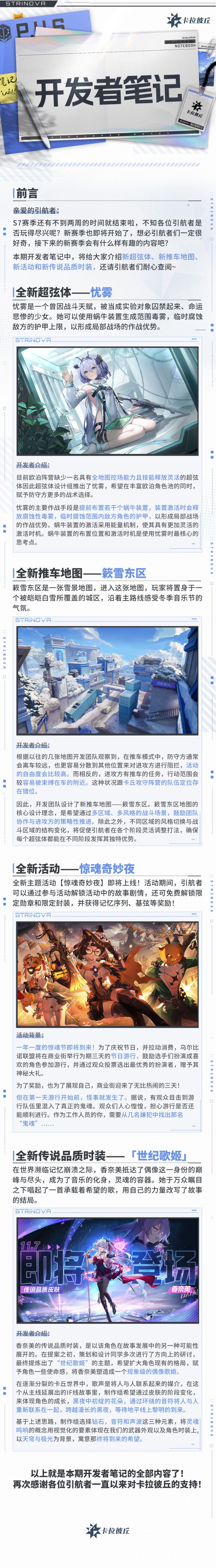 亲爱的引航者:大家好!S7赛季还有不到两周的时间就结束啦,不知各位引航者是否玩得尽兴呢?新赛季也即将开始了,想必引航者们一定很好奇,接下来的新赛季会有什么样有趣的内容吧?本期开发者笔记中,将给大家介绍新超弦体、极限推进全新地图、主题活动和香奈美全新传说品质时装,还请引航者们耐心查阅~