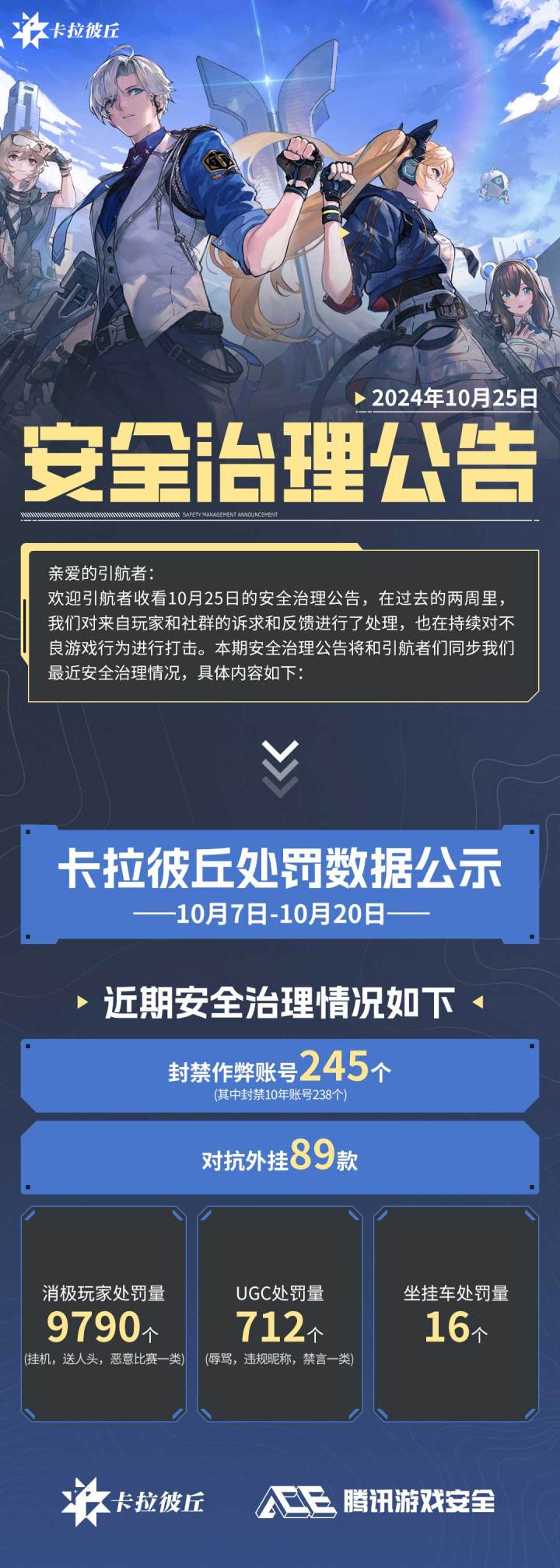 亲爱的引航者:欢迎引航者收看10月25日的安全治理公告,在过去的两周里,我们对来自玩家和社群的诉求和反馈进行了处理,也在持续对不良游戏行为进行打击。本期安全治理公告将和引航者们同步我们最近的安全治理情况,具体内容如下: