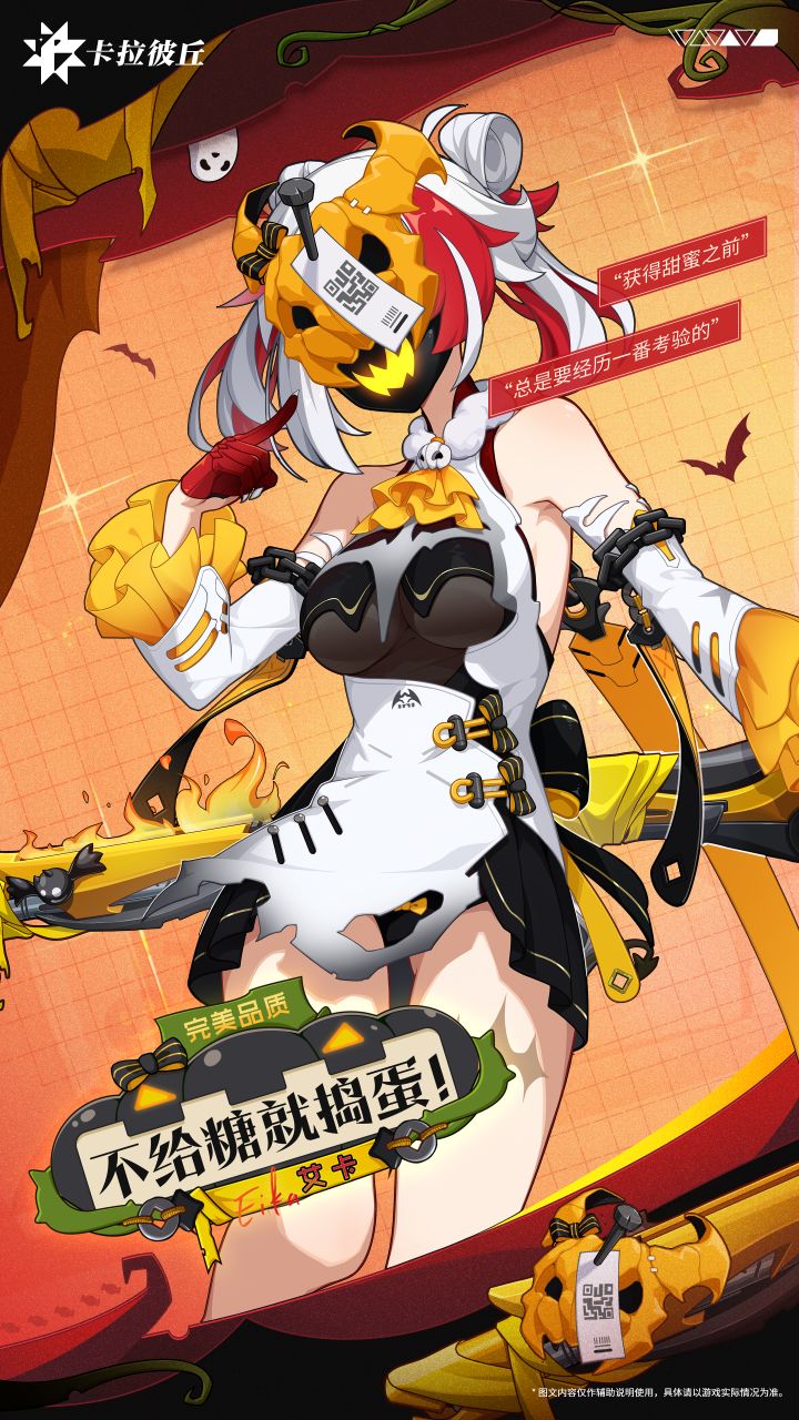 // 时装预览「不给糖就捣蛋!」“哈哈哈哈,我这身打扮确实不错呢,应该能吓到你们吧!还有,我的名字是‘艾卡’,不是什么‘给糖大使’也不是‘捣蛋小姐’,只是把参赛宣言和名字写反了而已……”