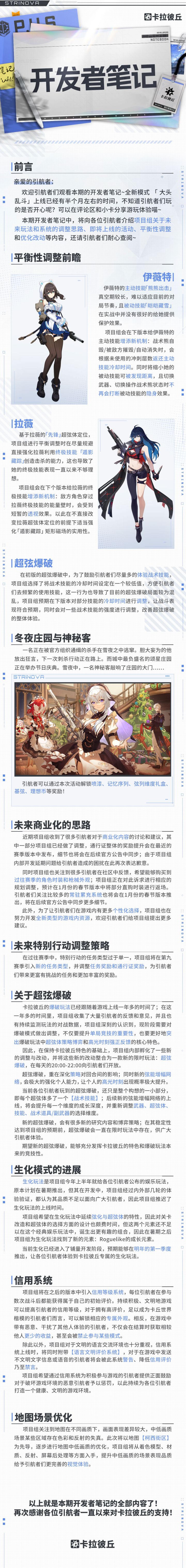 亲爱的引航者:欢迎引航者们观看本期的开发者笔记~全新模式「大头乱斗」上线已经有半个月左右的时间,不知道引航者们玩的是否开心呢?可以在评论区和小卡分享游玩体验喵~本期开发者笔记中,将向各位引航者介绍项目组关于未来玩法和系统的调整思路、即将上线的活动、平衡性调整及数据、和优化改动等内容,还请引航者们耐心查阅~