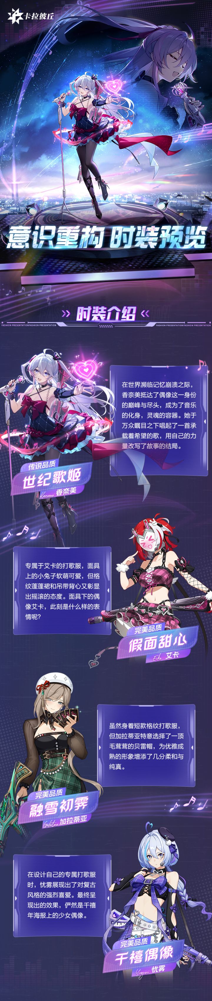 香奈美传说时装·「世纪歌姬」将于11月7日上线! 在世界濒临记忆崩溃之际,香奈美抵达了偶像这一身份的巅峰与尽头,成为了音乐的化身,灵魂的容器。 她于万众瞩目之下唱起了一首承载着希望的歌,用自己的力量改写了故事的结局。 “我会化作永恒的世纪之歌!”