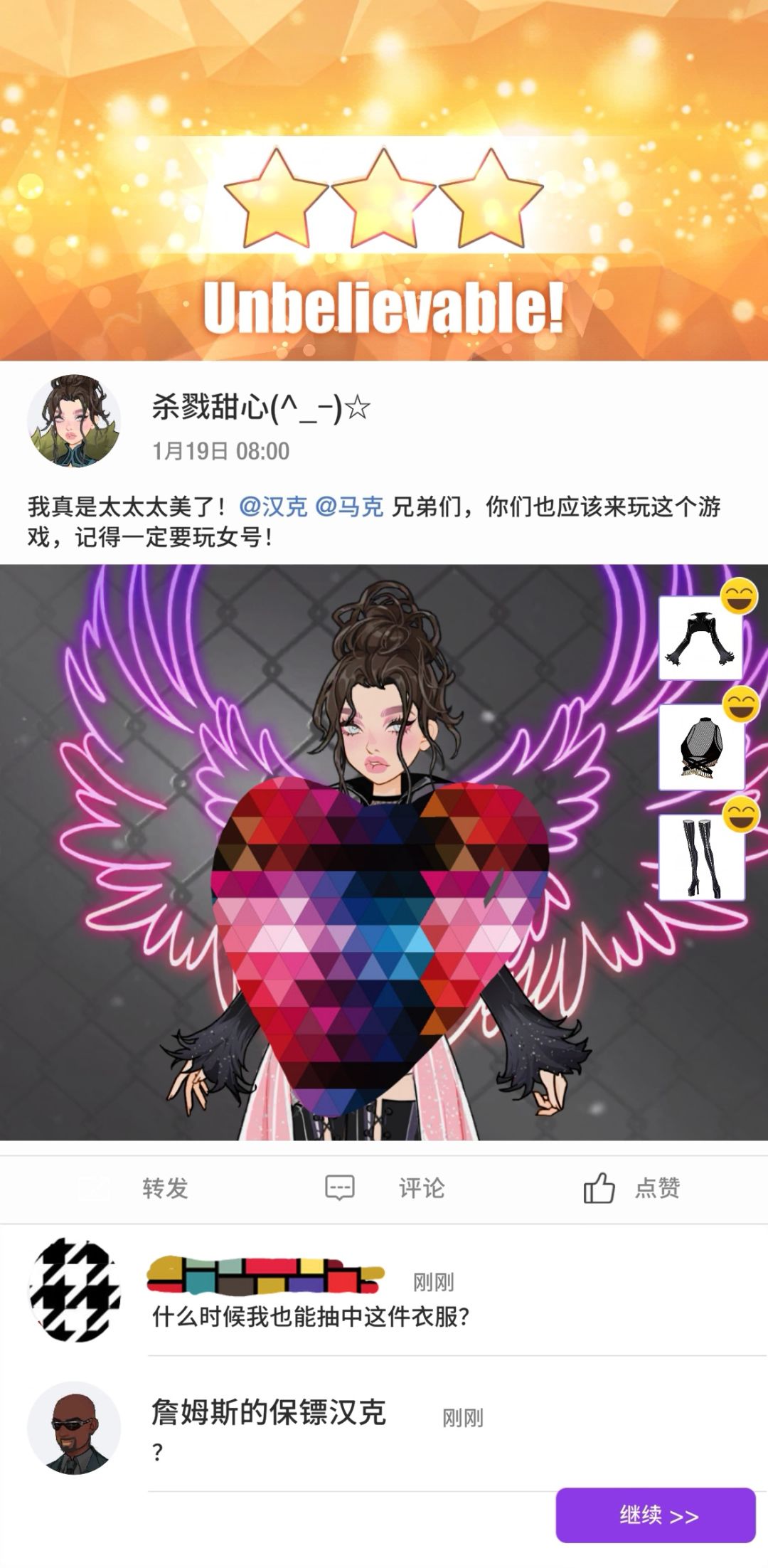 9-13必备衣物,羽毛要19个,羽毛副本一次需要15体力,掉落2-3个羽毛,也就是至少要7次羽毛副本,一共7*15=105体力,且每天限3次副本。 三天才能继续到下一关主线了,害。#瞬搭 #瞬搭内测 #瞬搭suit