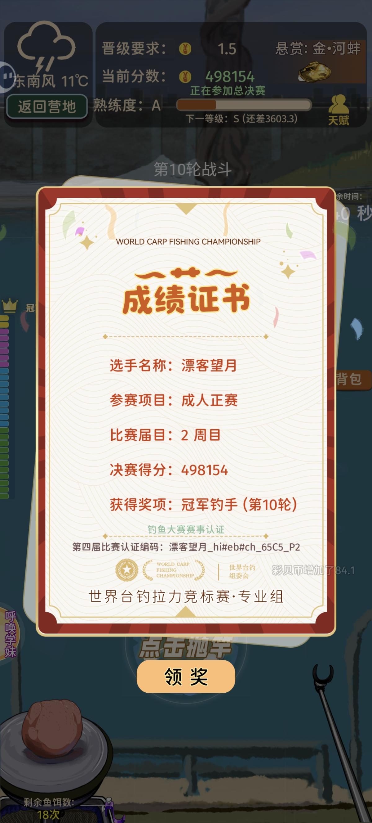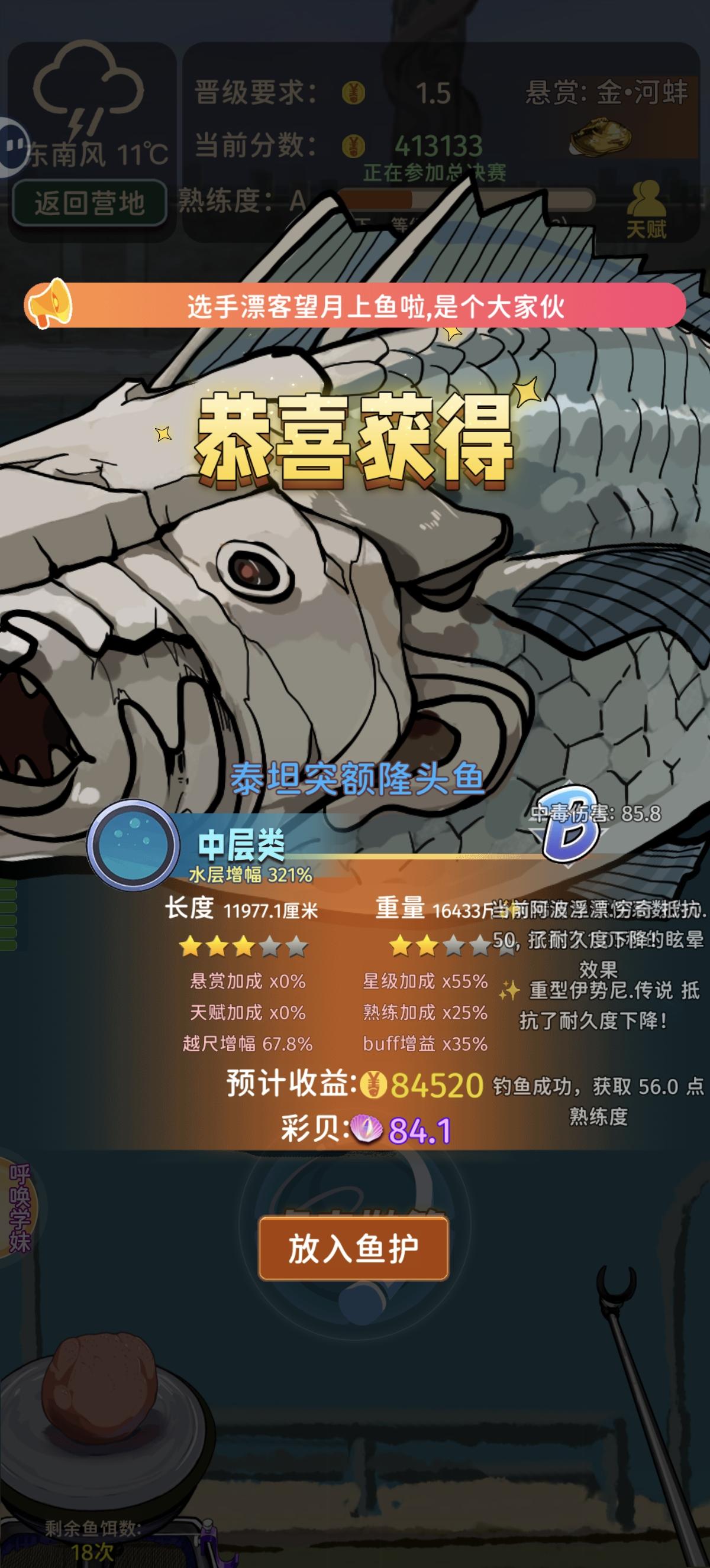 需要注意的是:1,装备在溜稀有鱼过程中可以更换,觉得目前强度不够了可以换背包里其他的,只要你手速快,手快换四个!2,每7天有个晋级赛,随机抽鱼溜,所以好的装备尽量留到这个时候,不然爆了要不轮回结束要不看广复活。